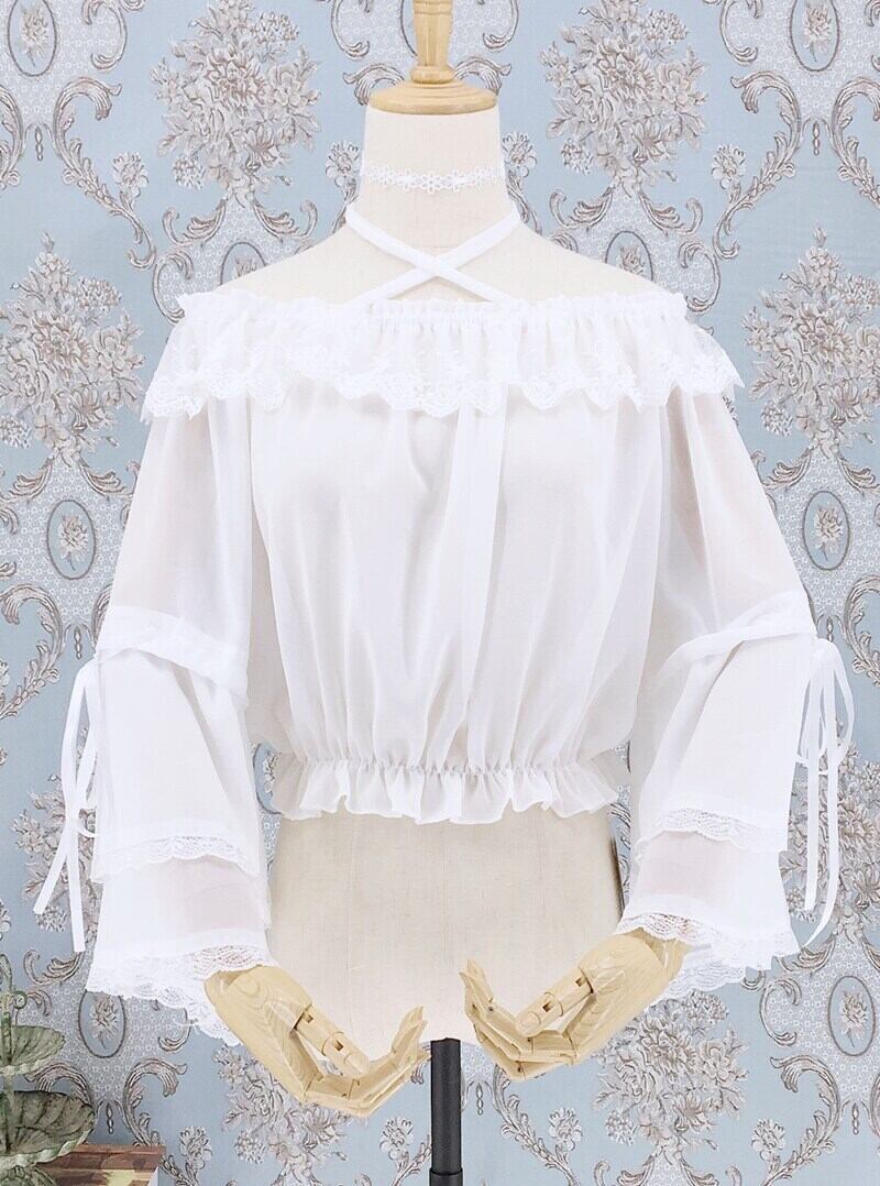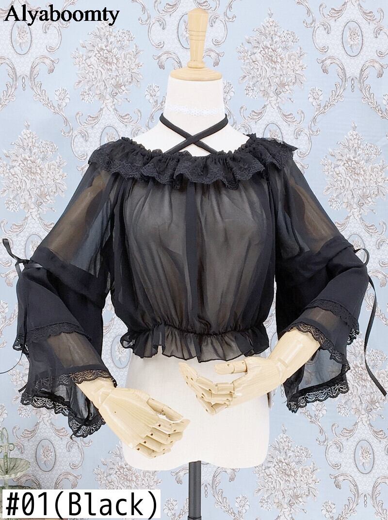 送料無料୨♥୧ スタイルレディースシフォンブラウス カラーホワイトブラックルーズスリーブシャツ バンドフリル フレアスリーブ ラッフル 大人ガーリー スウィート キュート カジュアル AOS78847615007