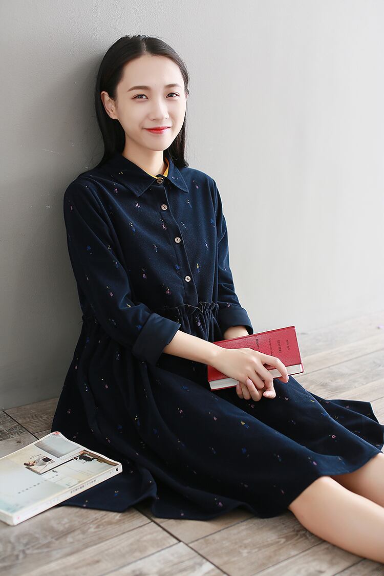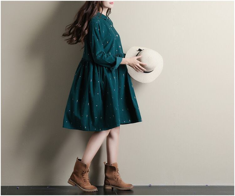送料無料୨♥୧ オータムウィンターレディースドレス ブルーグリーンプリント柄コーデュロイドレス ワンピース 大人ガーリー スウィート キュート カジュアル 秋物 冬物 AOS56116238985