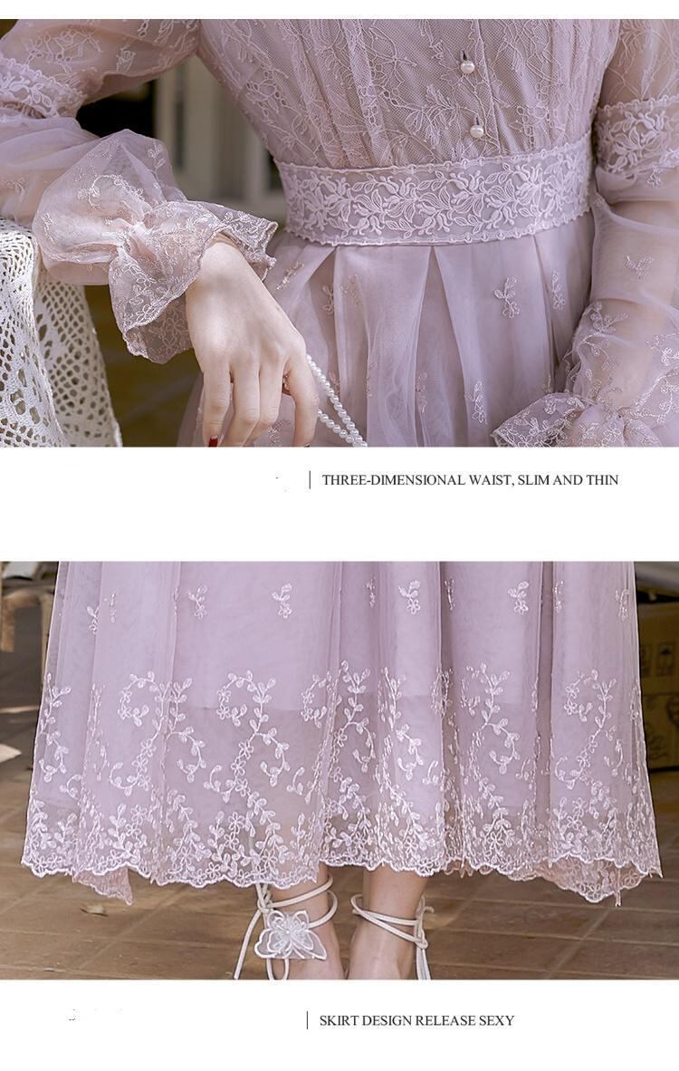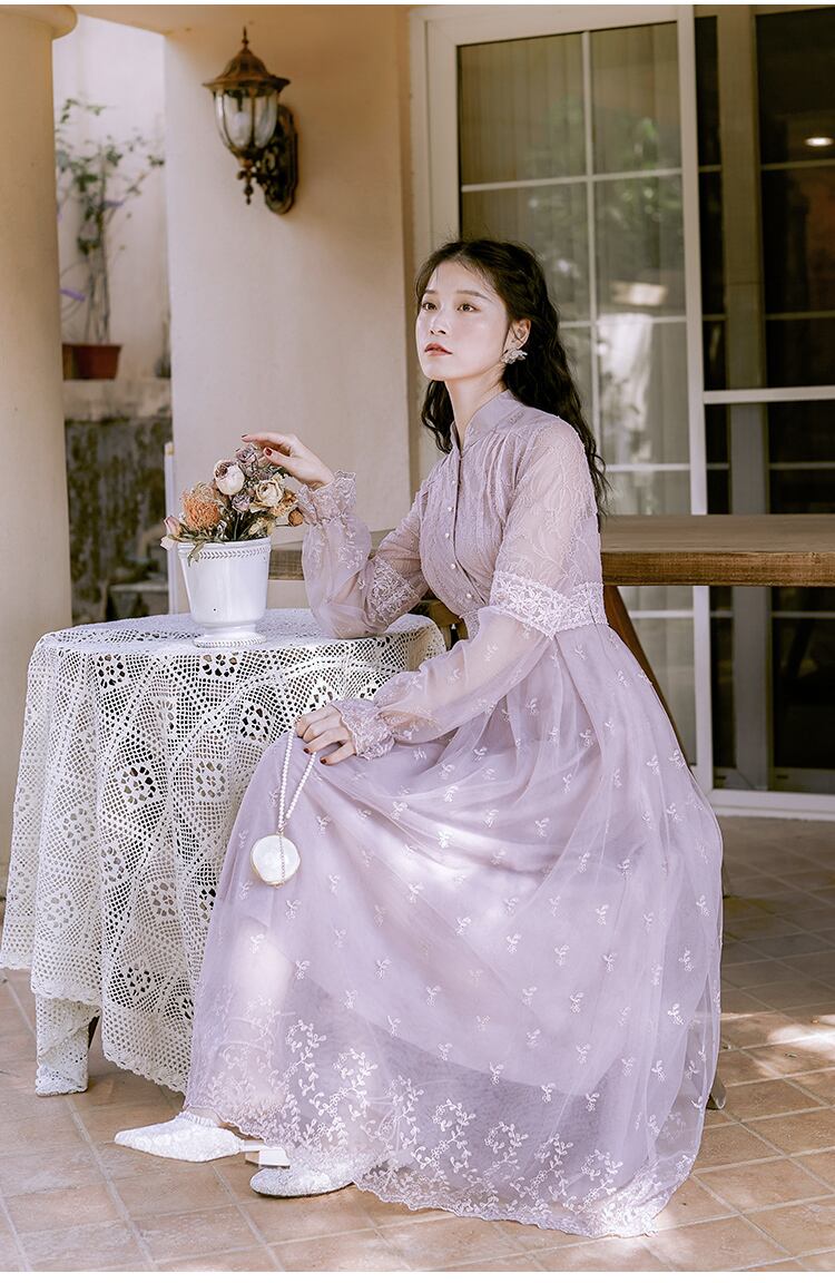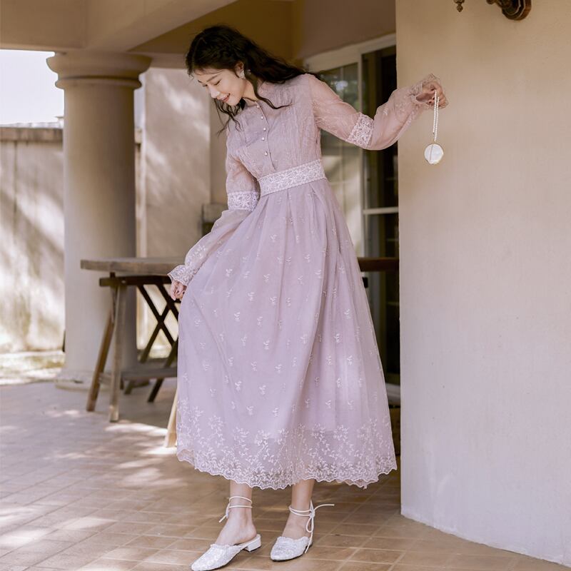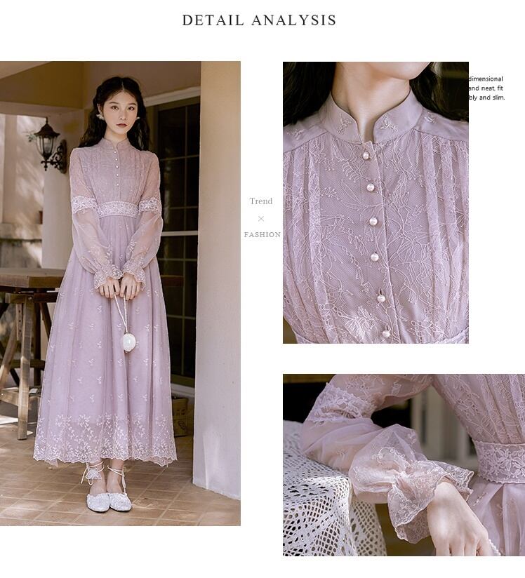 送料無料୨♥୧ スプリングオータムレディースマキシメッシュドレス スタンドカラーカラーフローラル刺繍レース 春物 秋物 花柄 パープル AOS43137521925