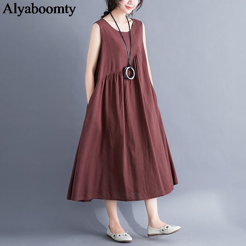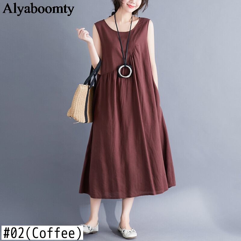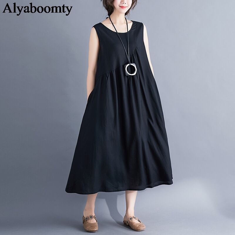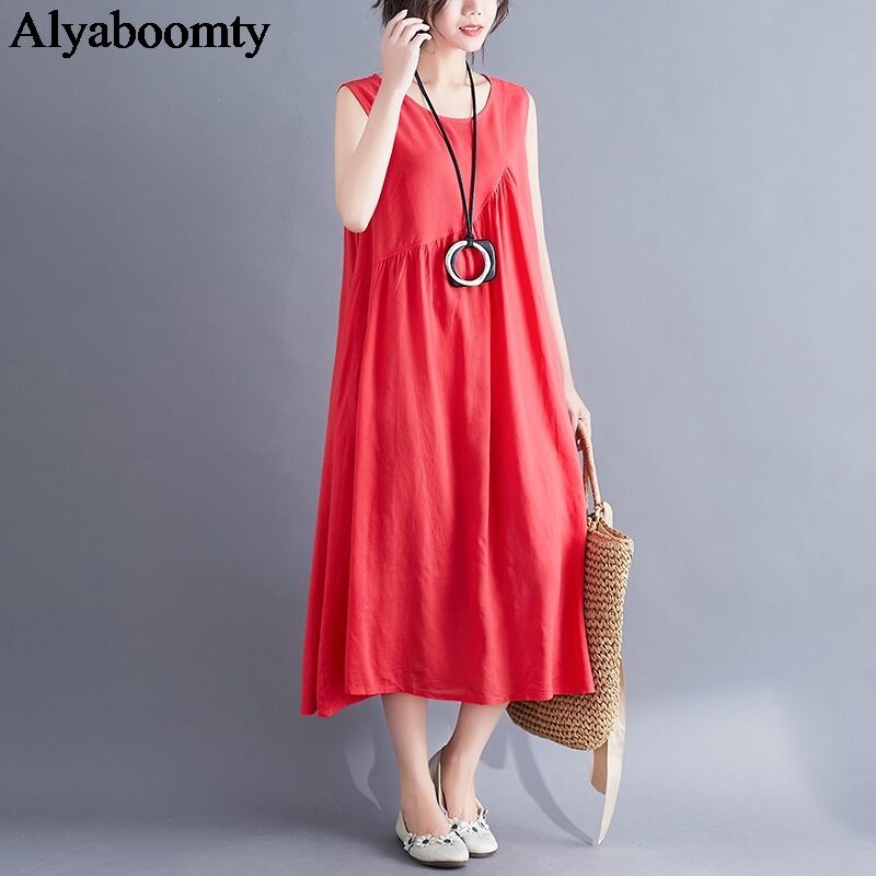 送料無料୨♥୧ サマーレディースロングドレス ブラックレッドルーズノースリーブドレス ワンピース コットン 夏物 Oネック AOS37389820906