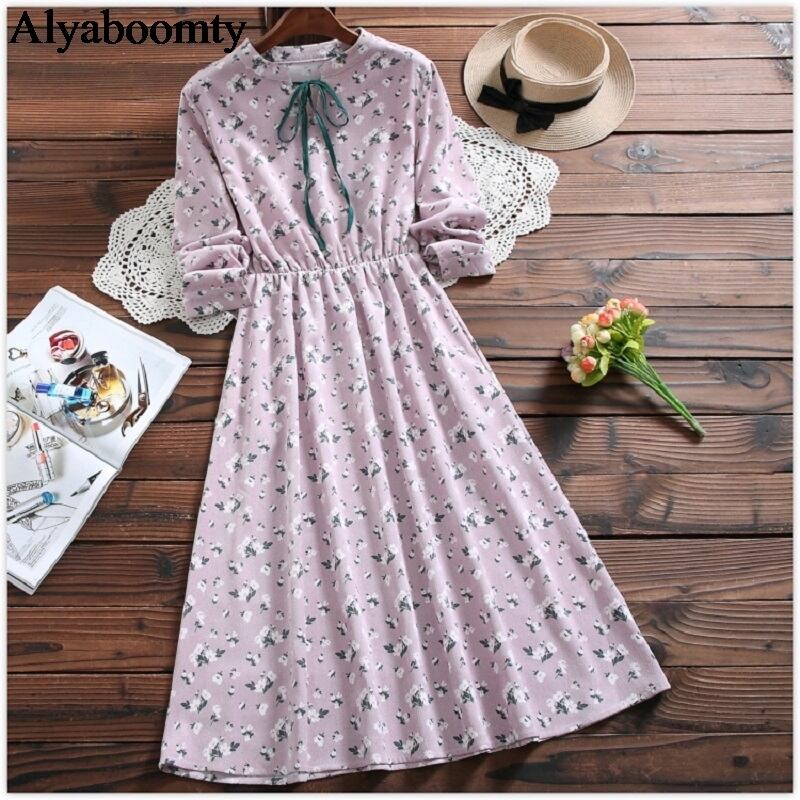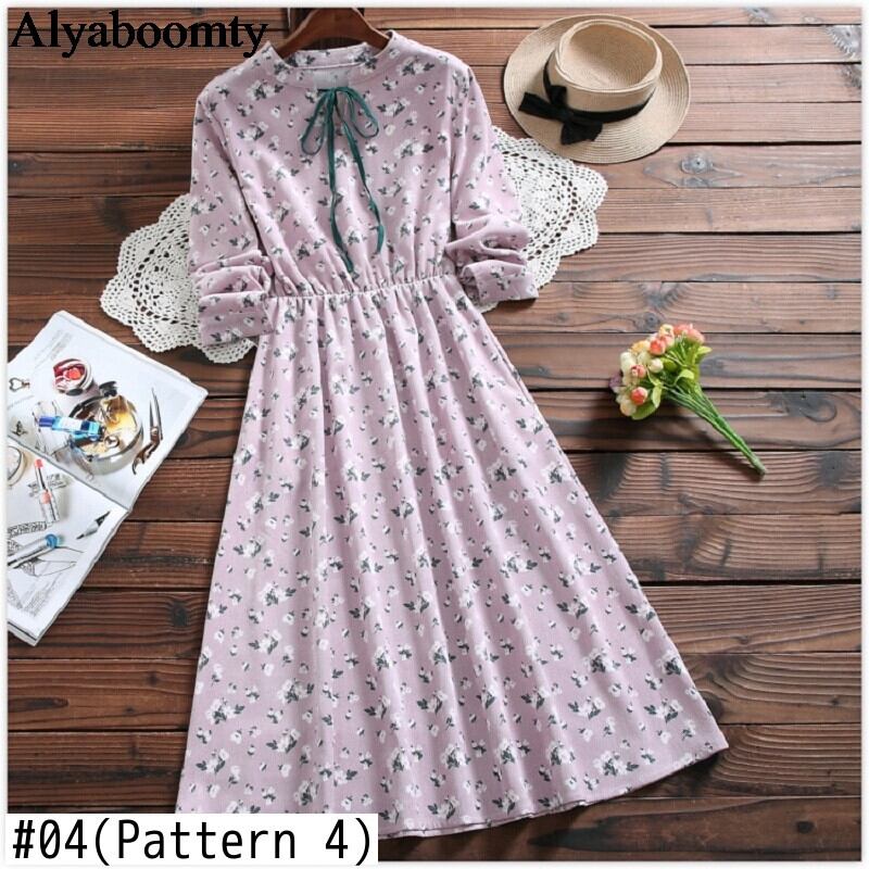送料無料୨♥୧ オータムスプリングレディースプリントヴィンテージコーデュロイミディドレス ロング エラスティック 伸縮 春物 秋物 ビンテージ AOS60078354885