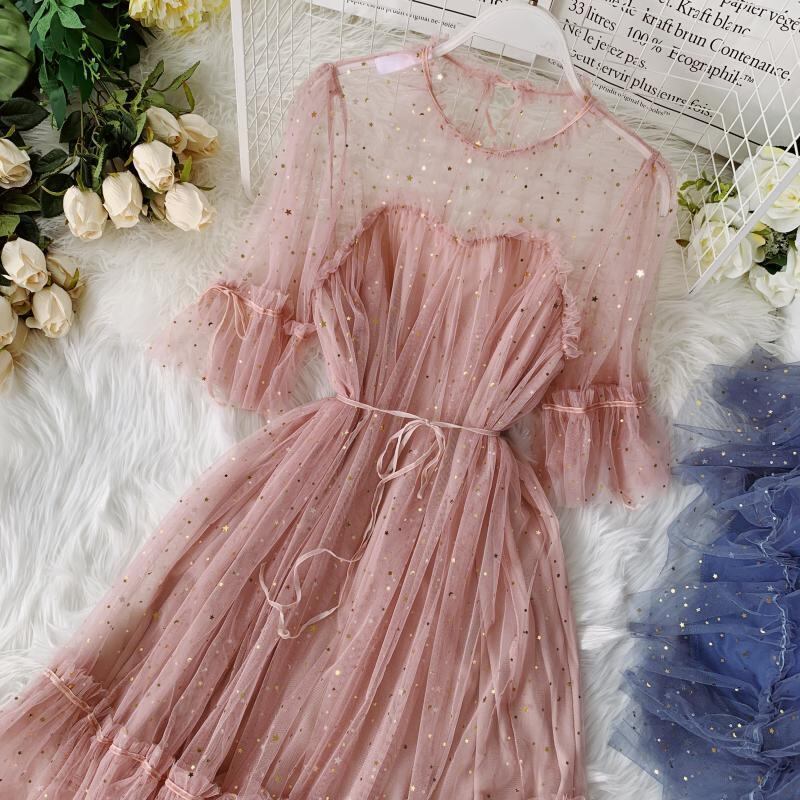送料無料୨♥୧ サマーレディースドレス ベージュブルーブラックスリーブ ピンク フレアスリーブ 夏物 AOS51759250712