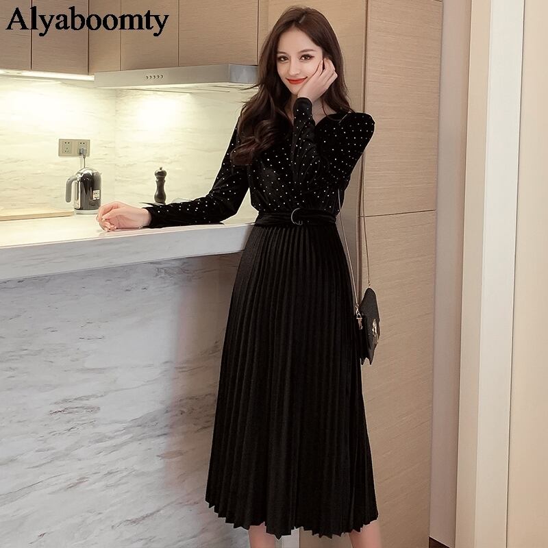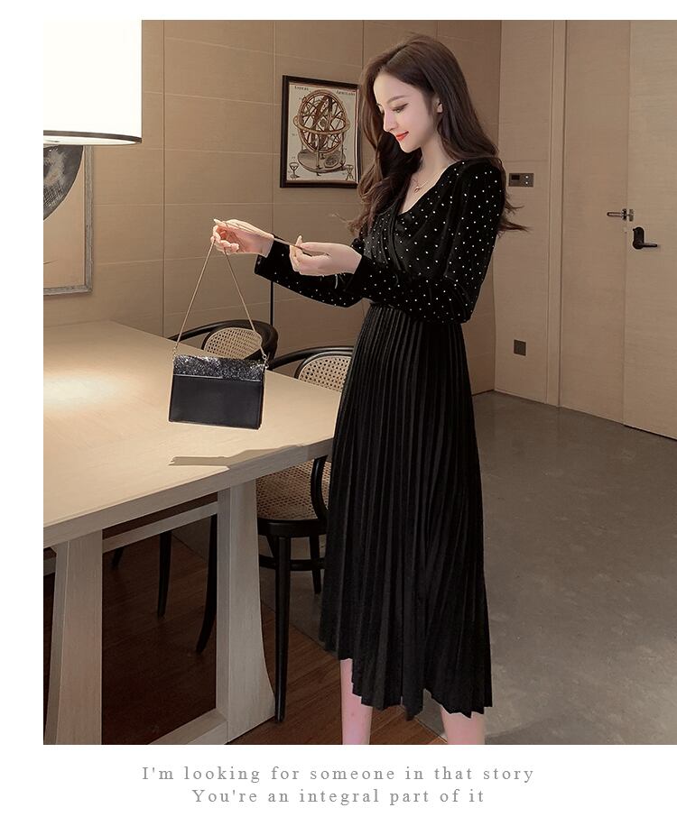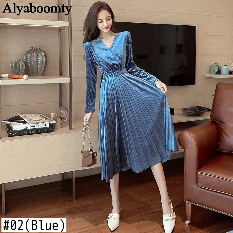 送料無料୨♥୧ オータムウィンターレディースミディドレス Vネックブラックブルーベルベットプリーツ 秋物 冬物 会社 学校 通勤や通学にも AOS15072705013