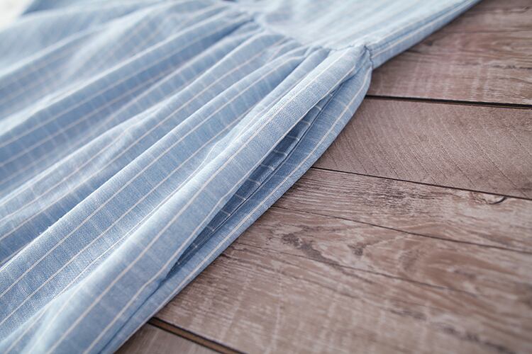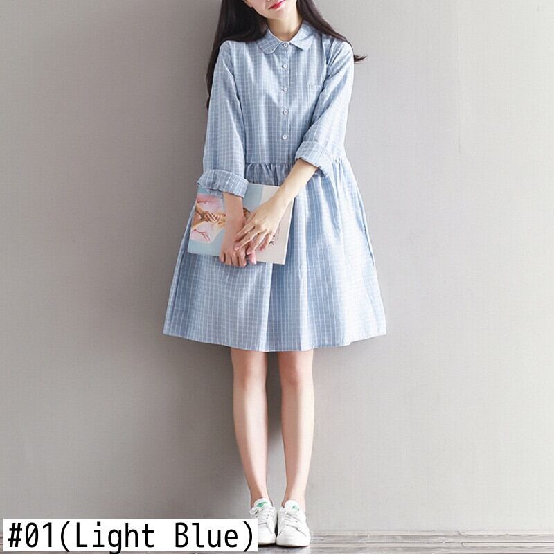 送料無料୨♥୧ スプリングオータムレディース格子柄ドレス カラースリーブスタンダードブルー コットン レトロ 大人ガーリー スウィート キュート カジュアル 春物 秋物 AOS5027093742