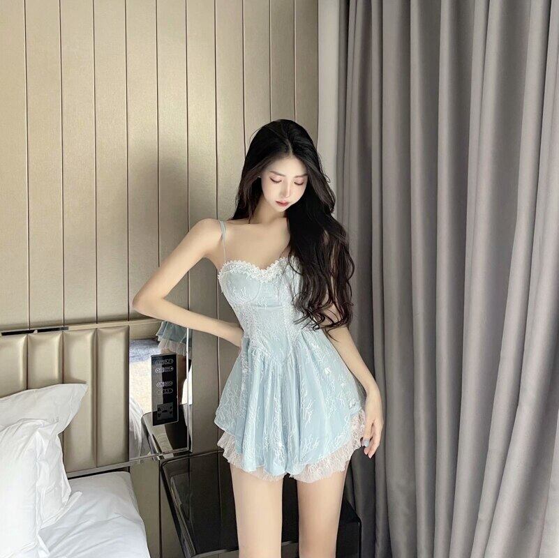 送料無料୨♥୧ サマーレディースブルーセット 刺繍ミニフリルショーツ レース ラッフル 大人ガーリー スウィート キュート カジュアル 夏物 ブルマー AOS29956095359