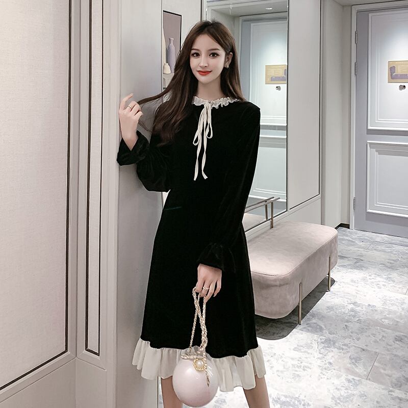 送料無料୨♥୧ スプリングオータムレディースブラックドレス カラーベルベットAラインフリルミディドレス ワンピース ラッフル 大人ガーリー スウィート キュート カジュアル 春物 秋物 AOS83709161724