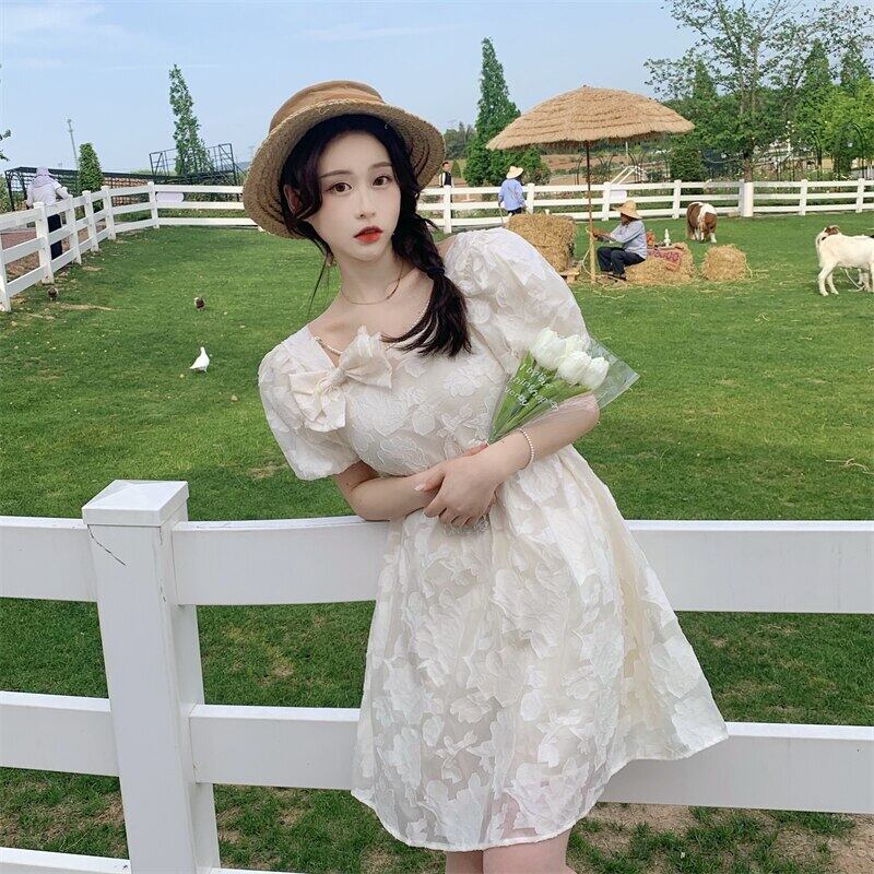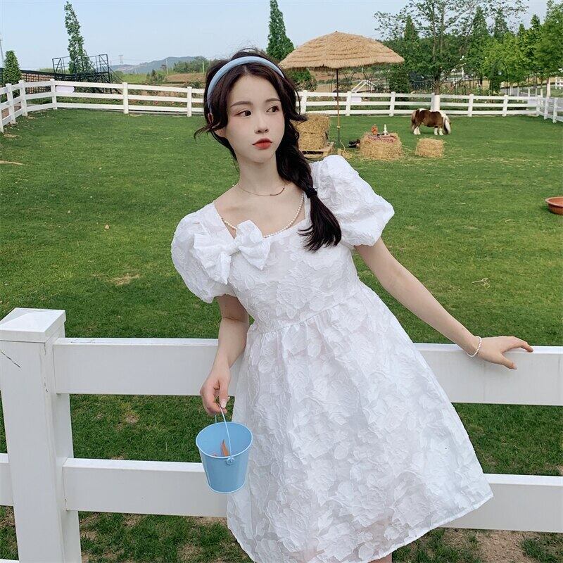 送料無料୨♥୧ サマーレディースミニドレス カラーホワイトブルーリボンスリーブ 大人ガーリー スウィート キュート カジュアル 夏物 スクウェア AOS46316722634