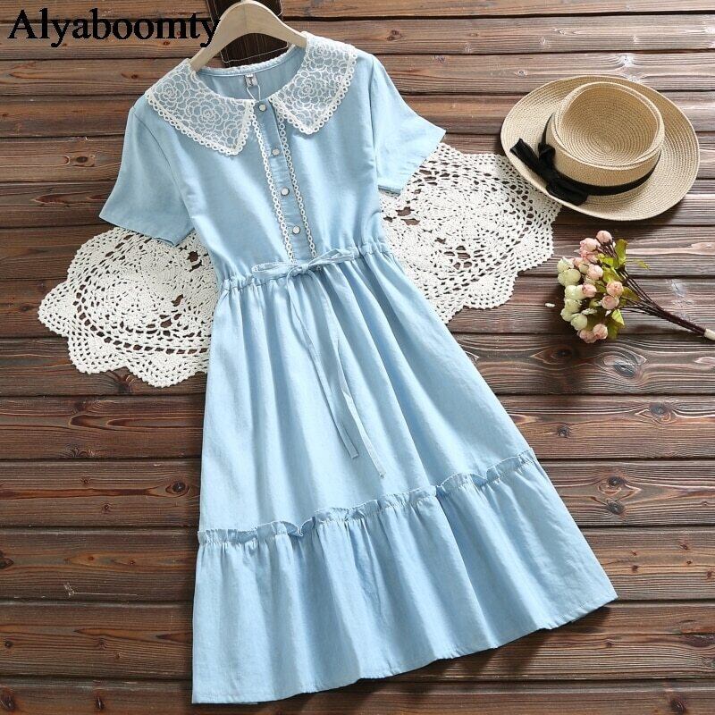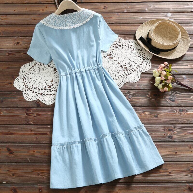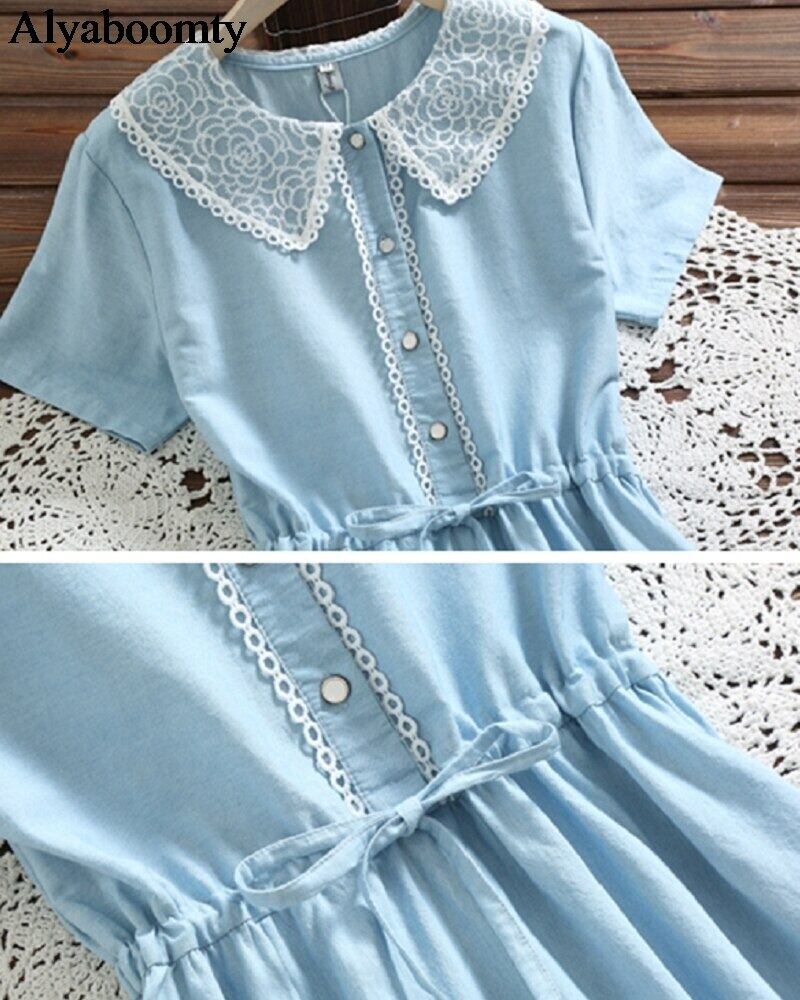 送料無料୨♥୧ サマーレディースブルードレス カラーレース半袖スリーブフリル ショート ハーフスリーブ ラッフル 大人ガーリー スウィート キュート カジュアル 夏物 AOS20343418427