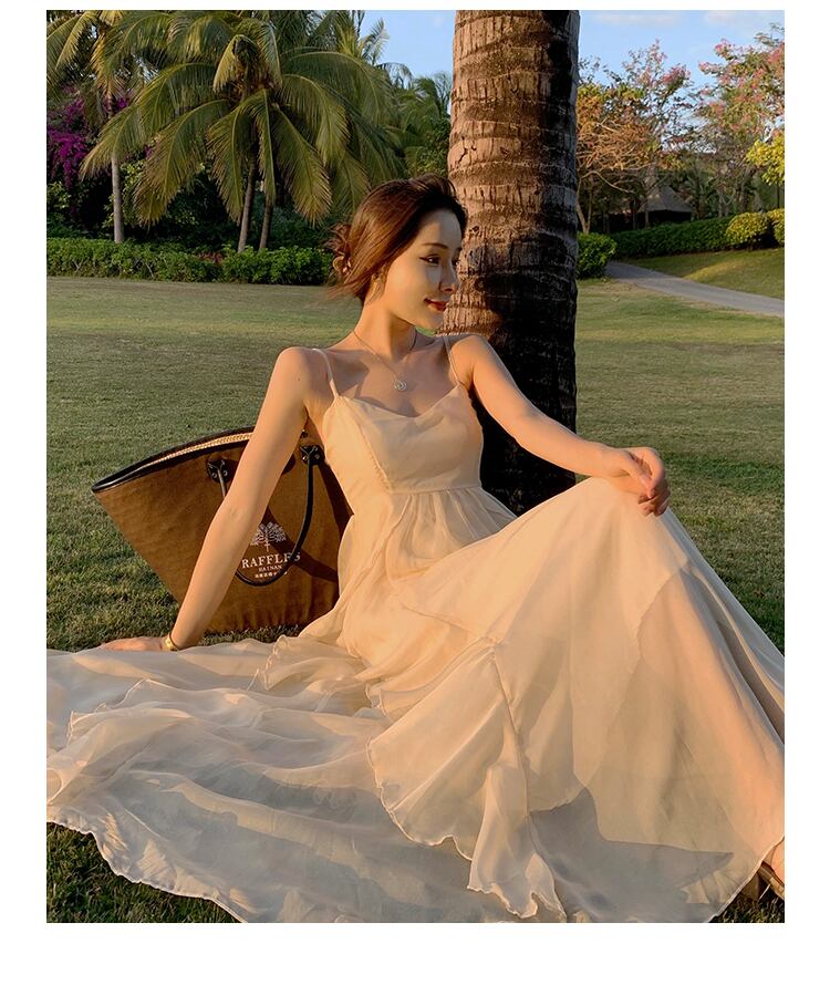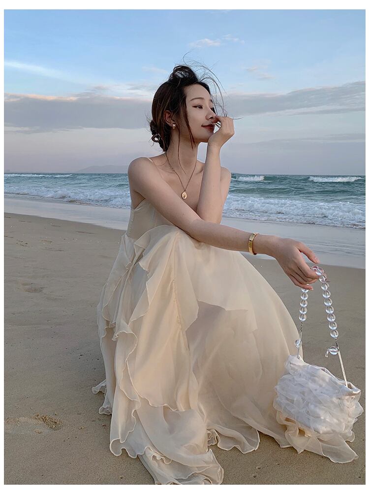 送料無料୨♥୧ サマーレディースノースリーブマキシドレス バックレスVネックカーキフリル ラッフル 夏物 ビーチ AOS62470358535