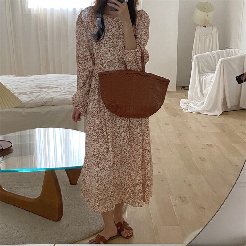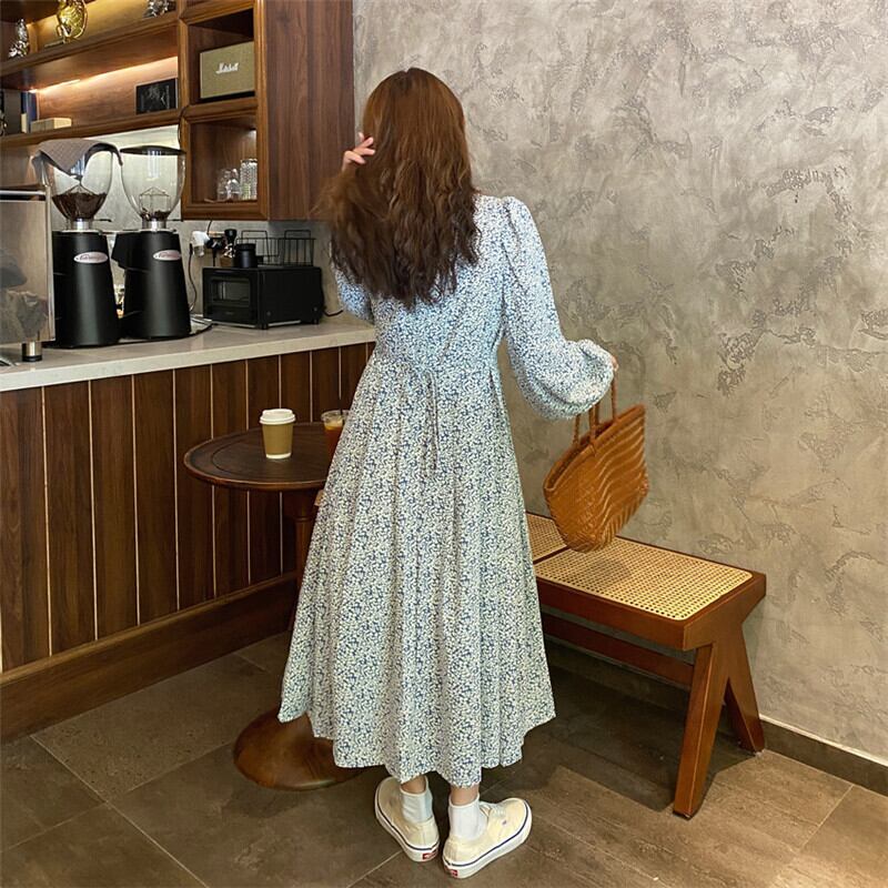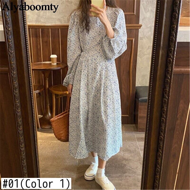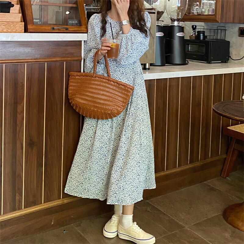 送料無料୨♥୧ スプリングオータムレディースロングドレス フローラルプリントブルーオレンジスリーブシフォンドレス ワンピース ランタンスリーブ 大人ガーリー スウィート キュート カジュアル 春物 秋物 花柄 Oネック AOS29055407349
