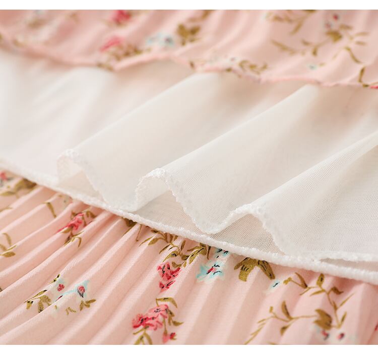 送料無料୨♥୧ スプリングオータムレディースロングドレス スタンドカラーカラーベージュフローラルプリントシフォンプリーツミディドレス ワンピース ピンク 大人ガーリー スウィート キュート カジュアル 春物 秋物 花柄 AOS42021224410