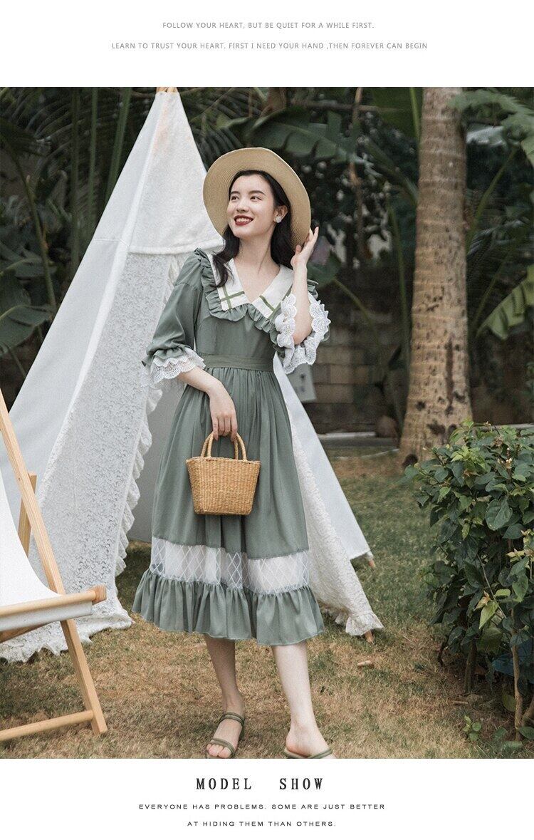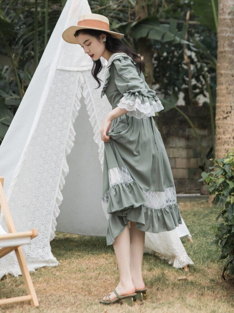 送料無料୨♥୧ サマーオータムレディースグリーンミディドレス カラースリーブレースフリルドレス ワンピース フレアスリーブ ラッフル 夏物 秋物 AOS62358463052