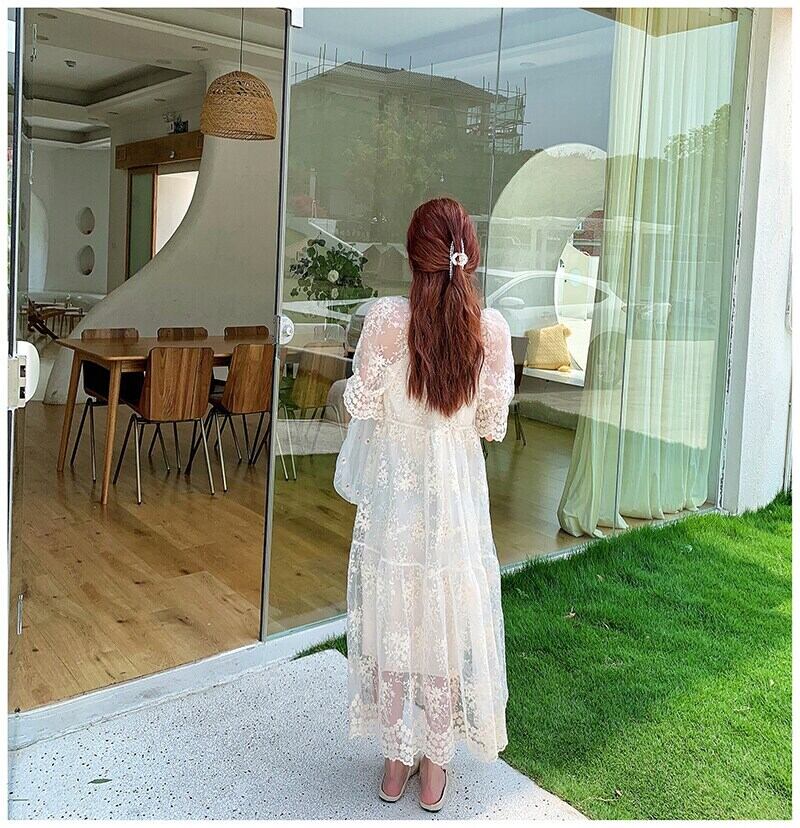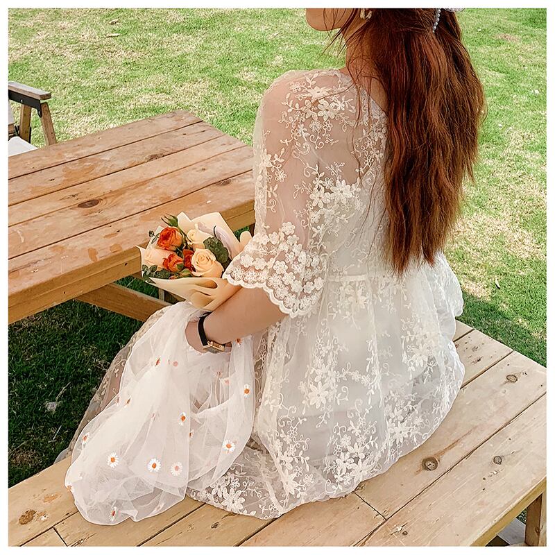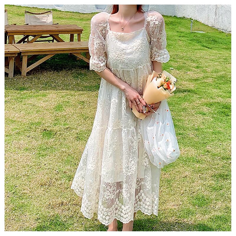送料無料୨♥୧ サマーレディースレースミディドレス カラーフローラル刺繍バギースリーブフリル ラッフル 夏物 花柄 スクウェア AOS90803186073