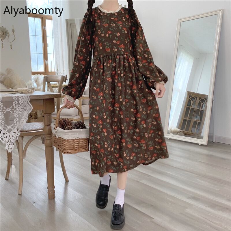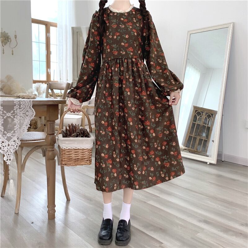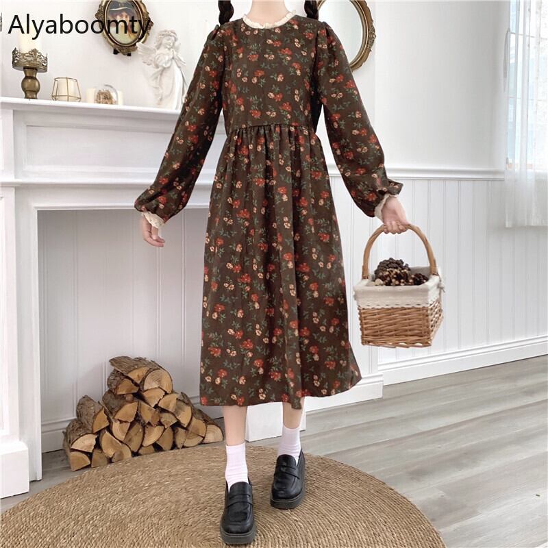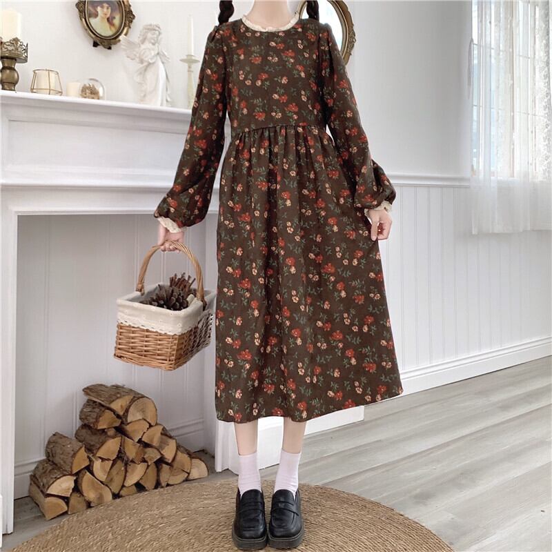 送料無料୨♥୧ スプリングレディースミディドレス レースカラーフローラルプリントヴィンテージコーデュロイ 大人ガーリー スウィート キュート カジュアル 春物 花柄 ビンテージ AOS80884980489
