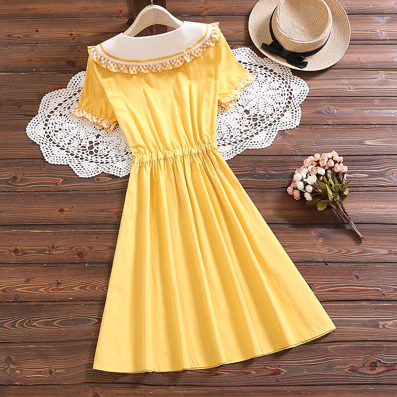 送料無料୨♥୧ サマーレディースイエロードレス カラーフリル刺繍レース半袖スリーブ ショート ハーフスリーブ ラッフル 夏物 レースアップ AOS64882384638