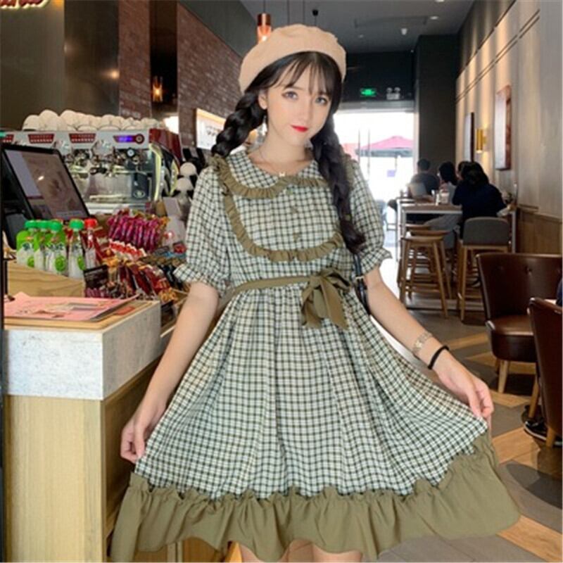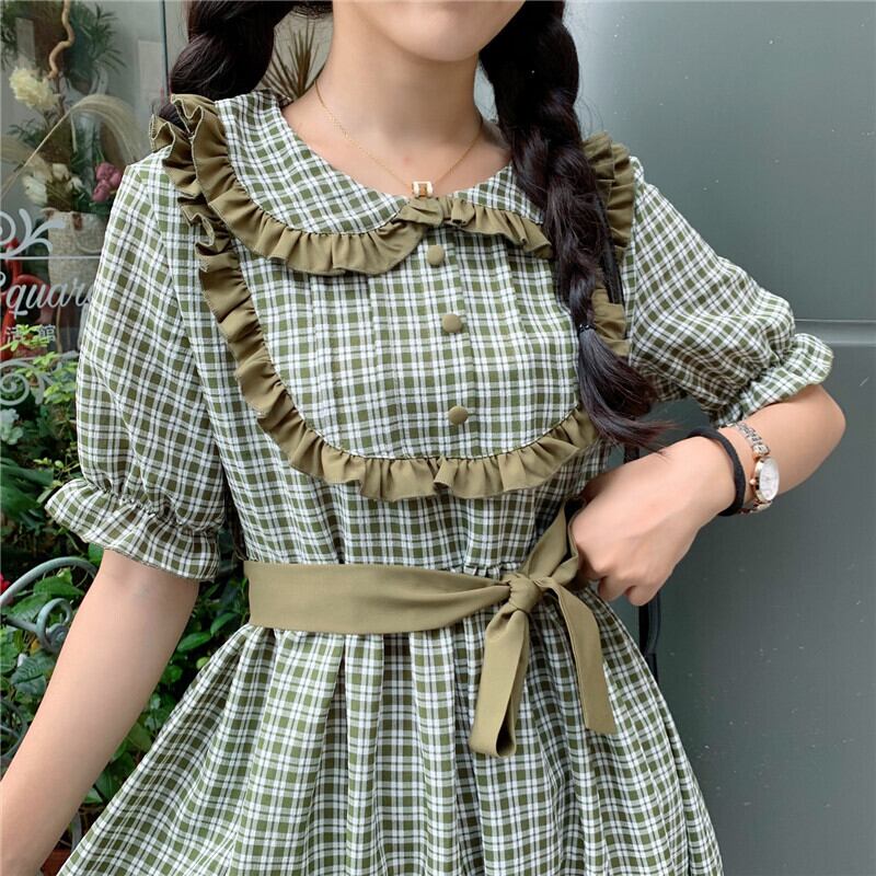 送料無料୨♥୧ サマードレス カラーグリーン格子柄パッチワーク半袖スリーブフリル ショート ハーフスリーブ ラッフル 夏物 AOS68859619107