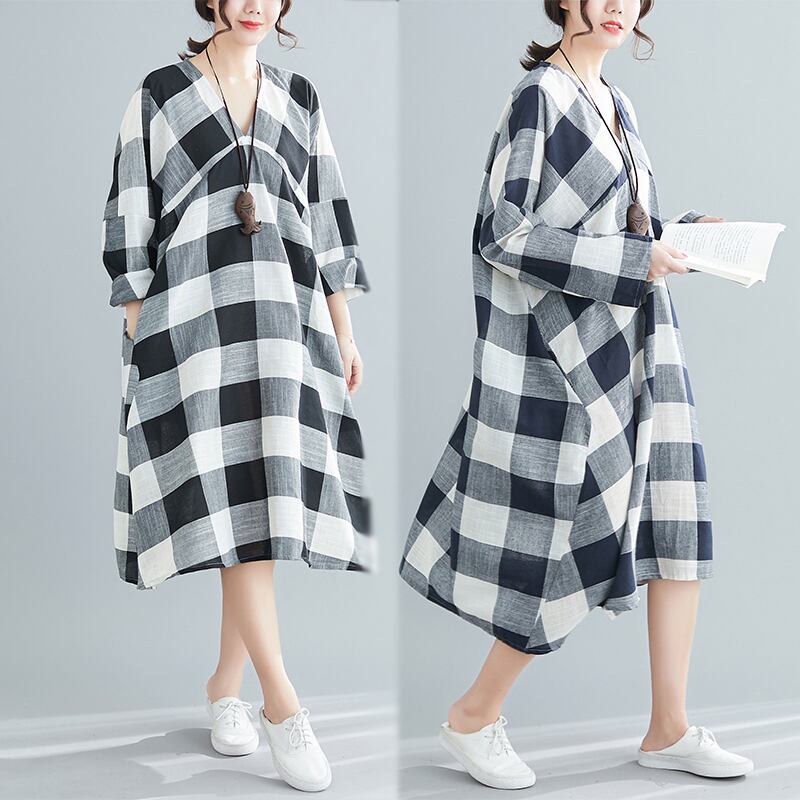 送料無料୨♥୧ サマーレディースシャツ ドレス Vネックブラックネイビーブルー格子柄 コットン 夏物 AOS54697458677