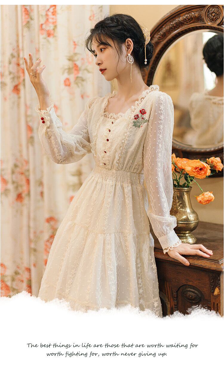 送料無料୨♥୧ オータムスプリングレディースフランス語妖精ミディドレス 平方カラーアプリコットローズ刺繍フリルパーティー AOS13711902445