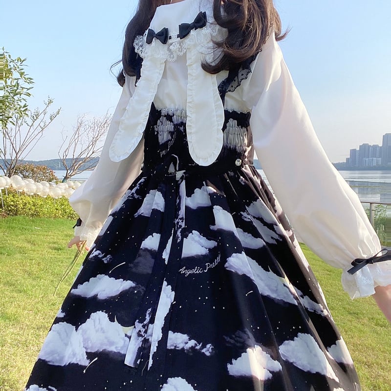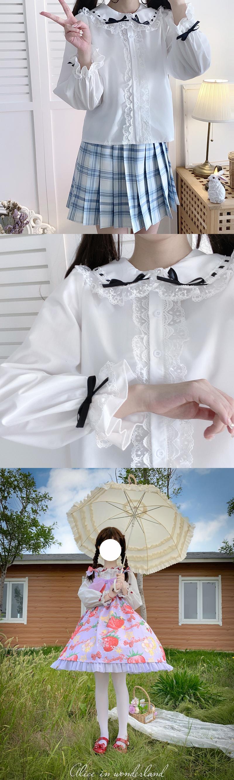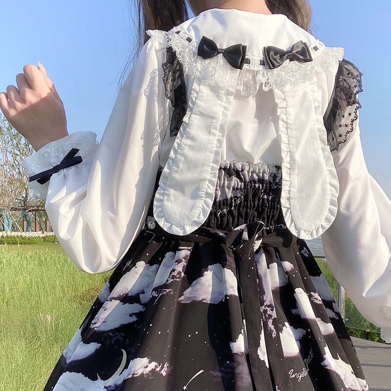 送料無料୨♥୧ スプリングオータムレディースロリータバニーシャツ ピーターパンカラーピンクブルーブラックリボンレースフリル可愛いホワイト甘いブラウス AOS69346843720