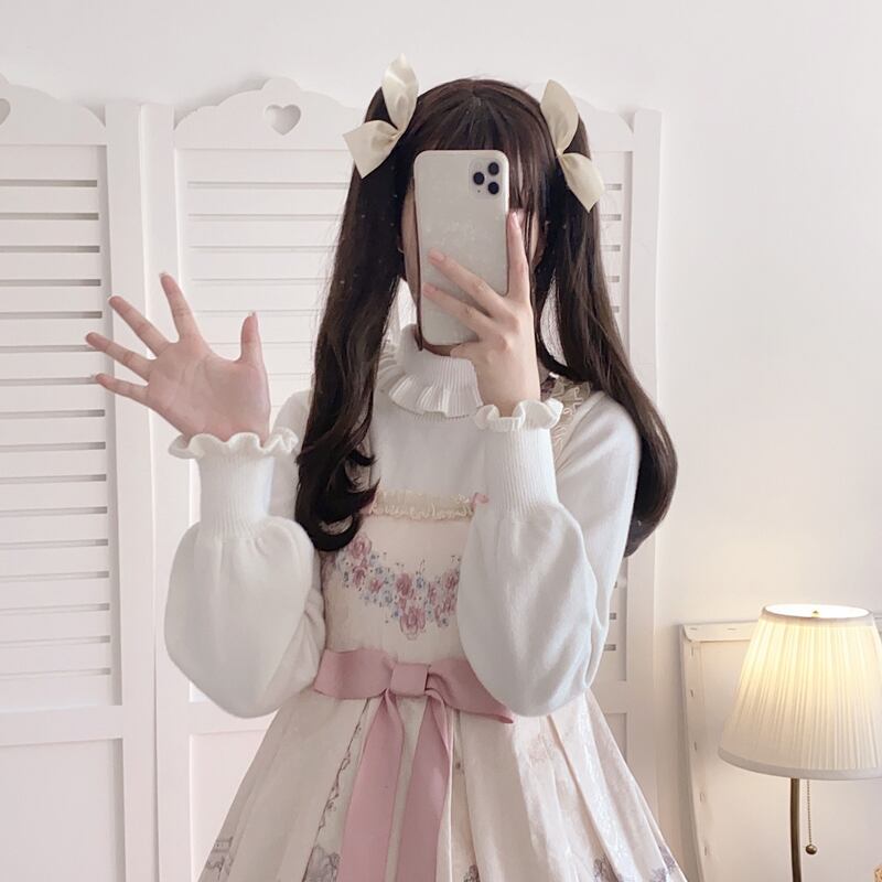 送料無料୨♥୧ eseロリータスタイルオータムウィンターレディースセーター タートルネック柔らかいソリッド ニットプルオーバー 可愛いレンタンスリーブフリルトップス AOS56054779558