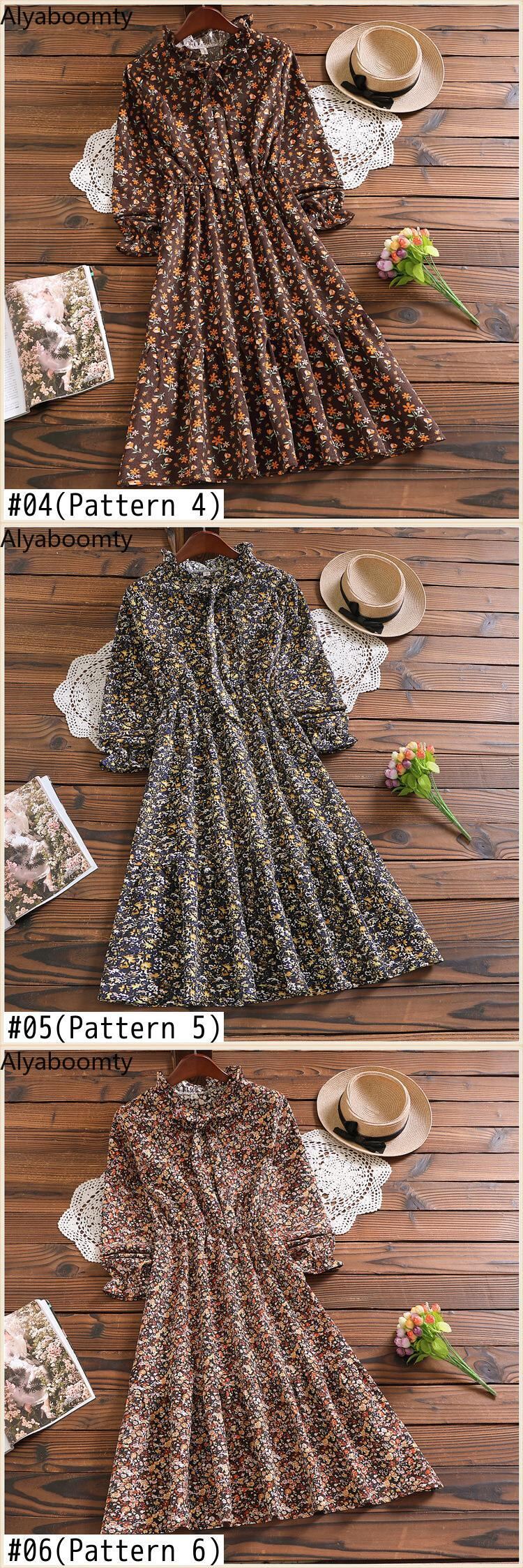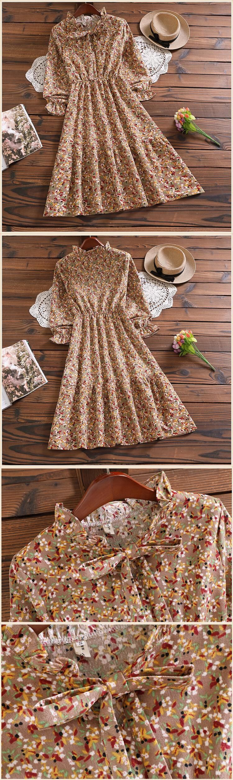 送料無料୨♥୧ スプリングレディースミディドレス カラーフローラルプリント柄ヴィンテージ長袖スリーブコーデュロイ ロング 大人ガーリー スウィート キュート カジュアル 春物 花柄 ビンテージ AOS46206109691