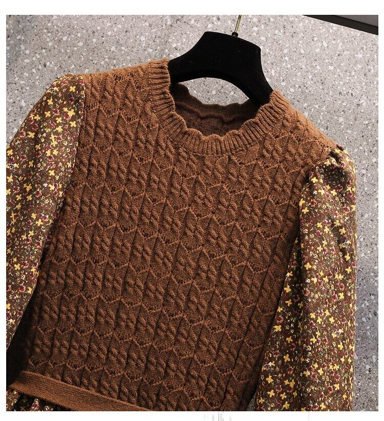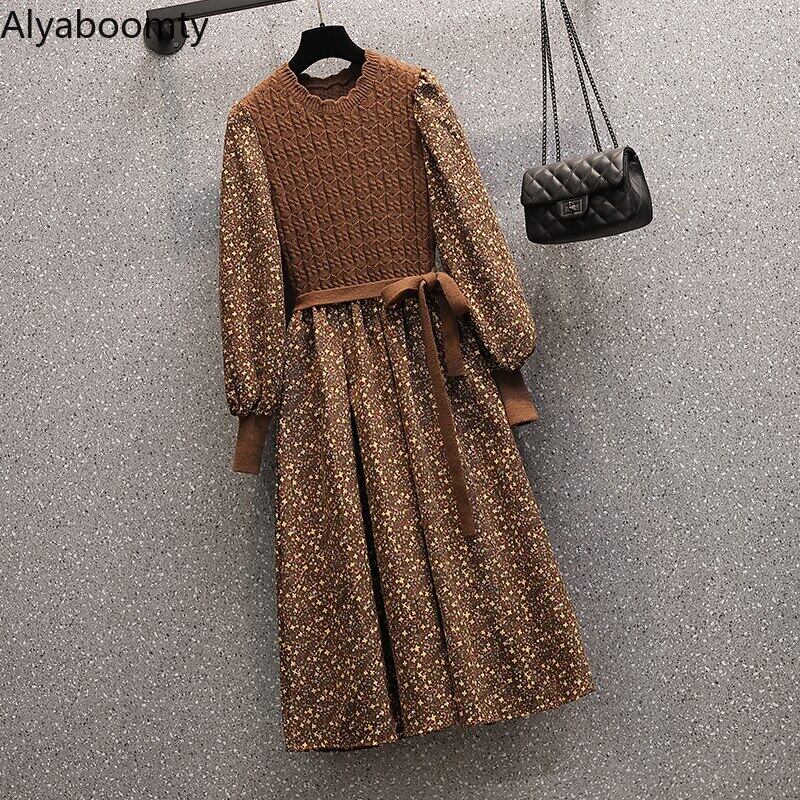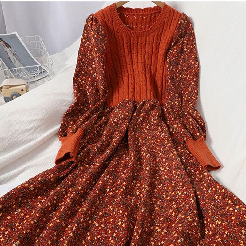 送料無料୨♥୧ 4オータムウィンターレディースロングヴィンテージドレス パッチワークニットコーデュロイランタンスリーブベージュブルーオレンジミディ AOS49007726312