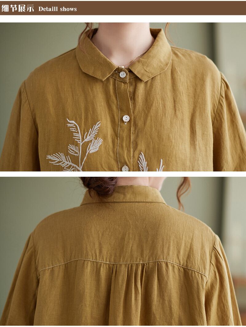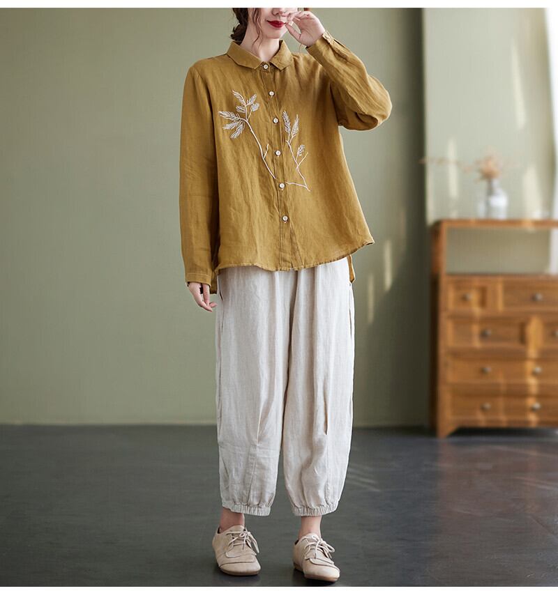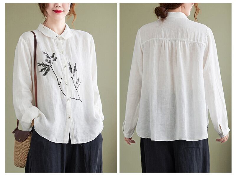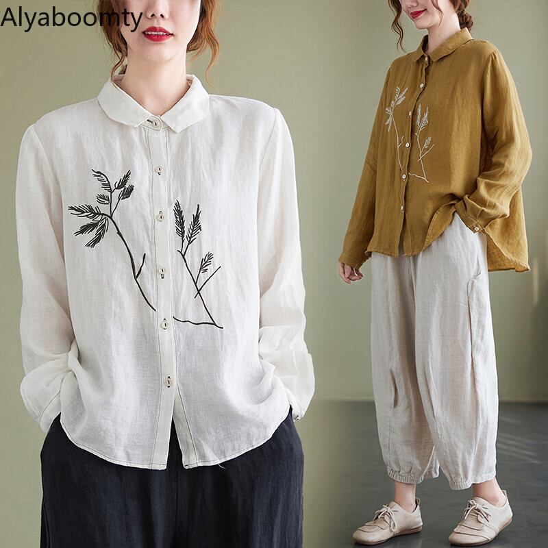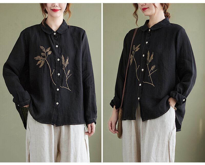 送料無料୨♥୧ スプリングオータムレディース特大ブラウス ブラックホワイトイエロー刺繍ルーズコットンヴィンテージバギーシャツ AOS64615470635