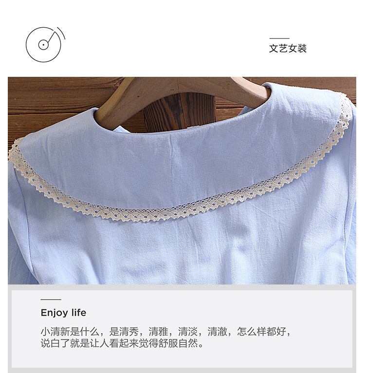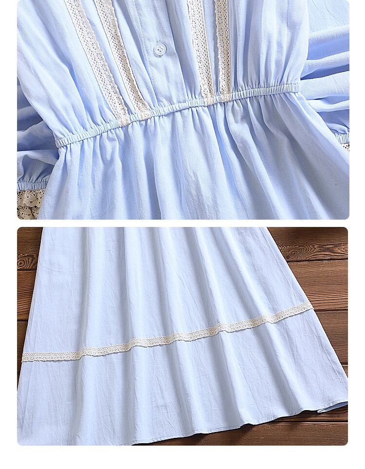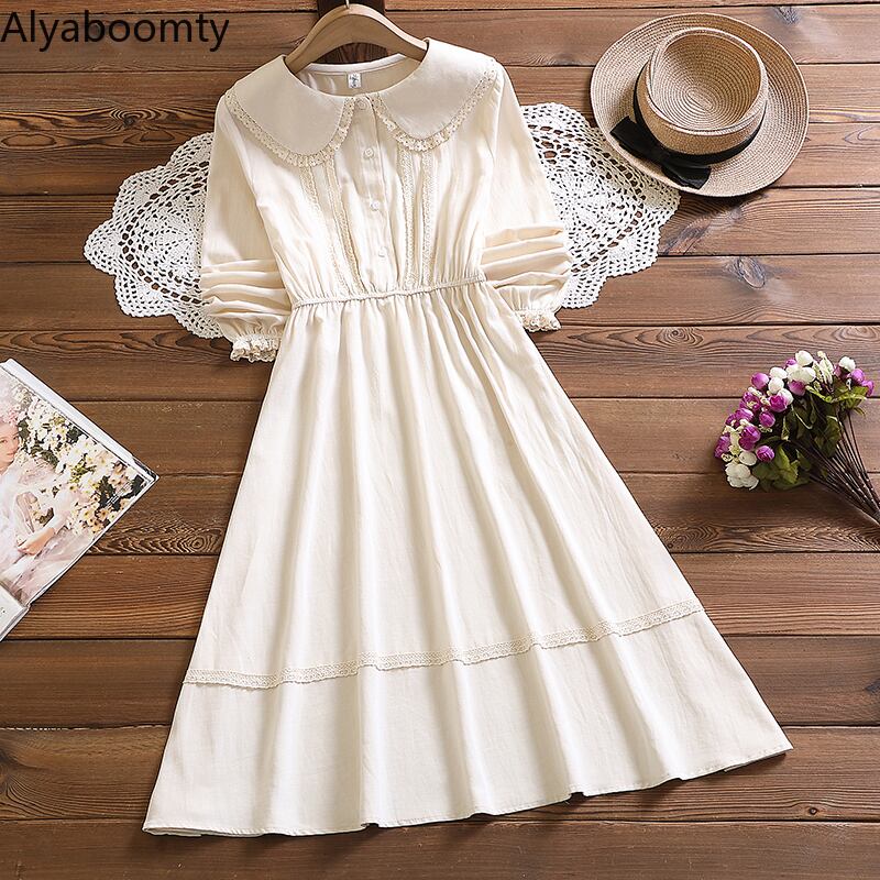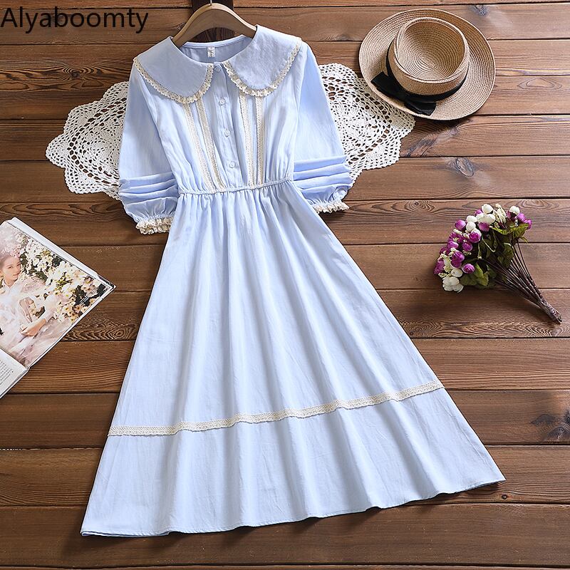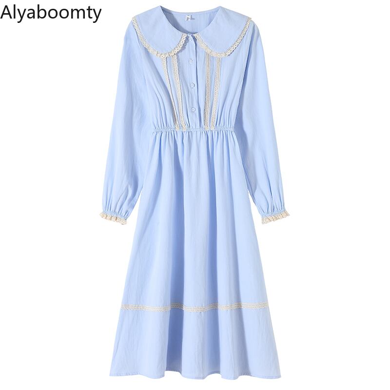 送料無料୨♥୧ eseプレッピースタイルオータムレディースミディドレス ピーターパンカラーアプリコットブルー新鮮な甘いコットンとレース AOS14542621480