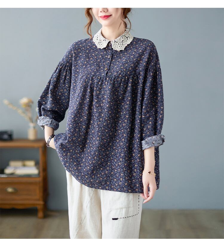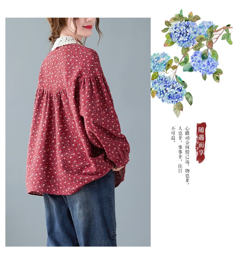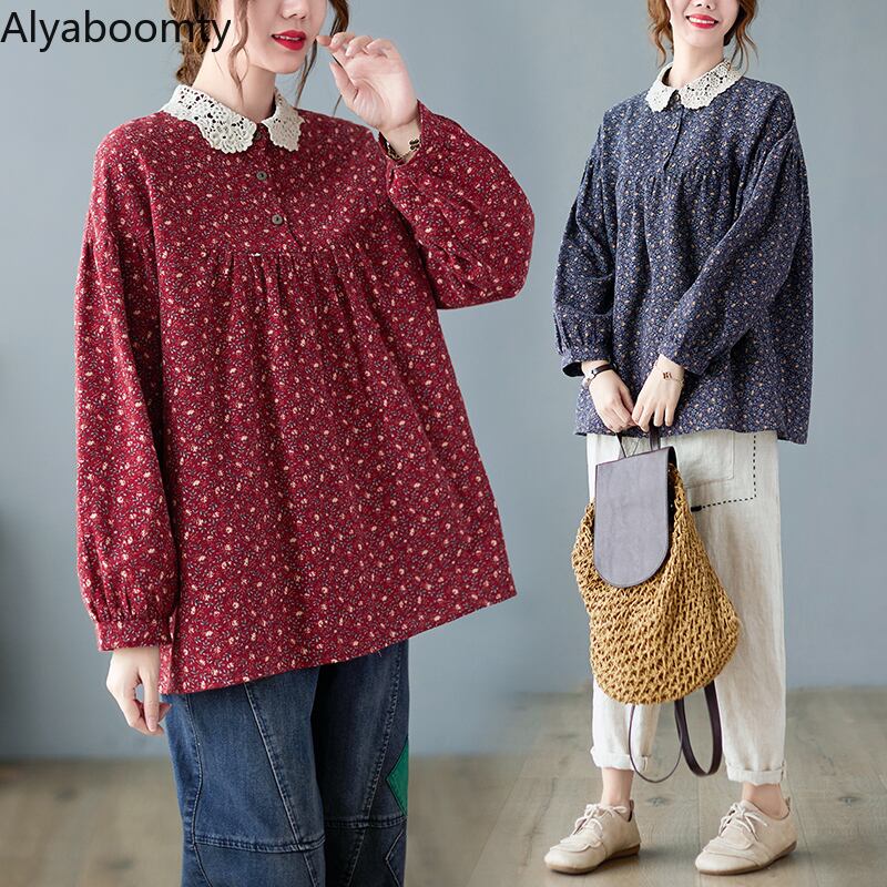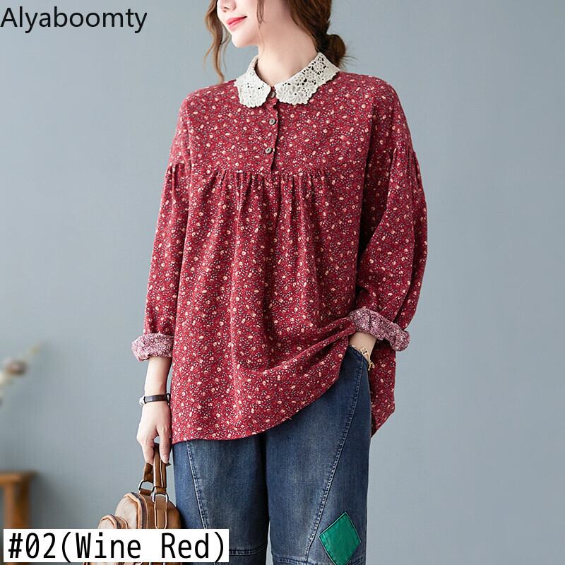 送料無料୨♥୧ 森スプリングオータムレディース特大ブラウス ピーターパンカラーとレースワインレッドネイビーフローラルヴィンテージルーズシャツ AOS40396445854