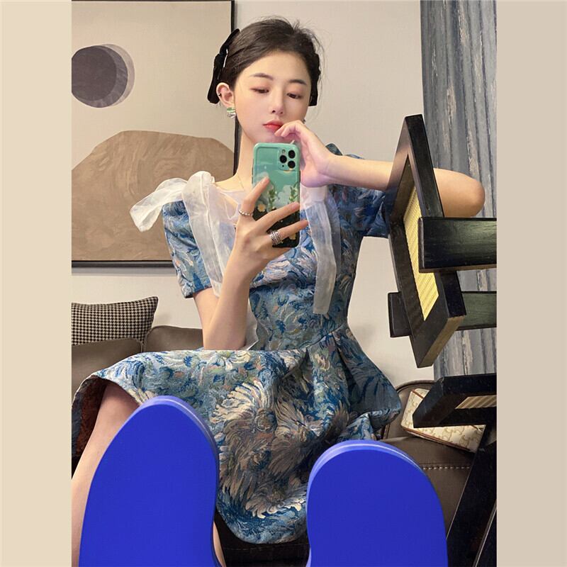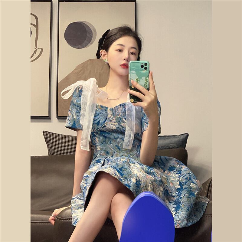 送料無料୨♥୧ サマーレディースフランス語スタイルミニパーティードレス 平方カラーリボンフローラルプリントスタンダードウェストヴィンテージパフスリーブ AOS26586968850