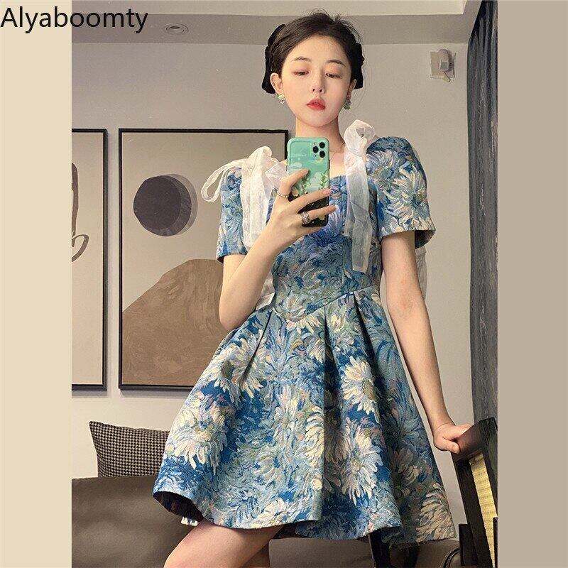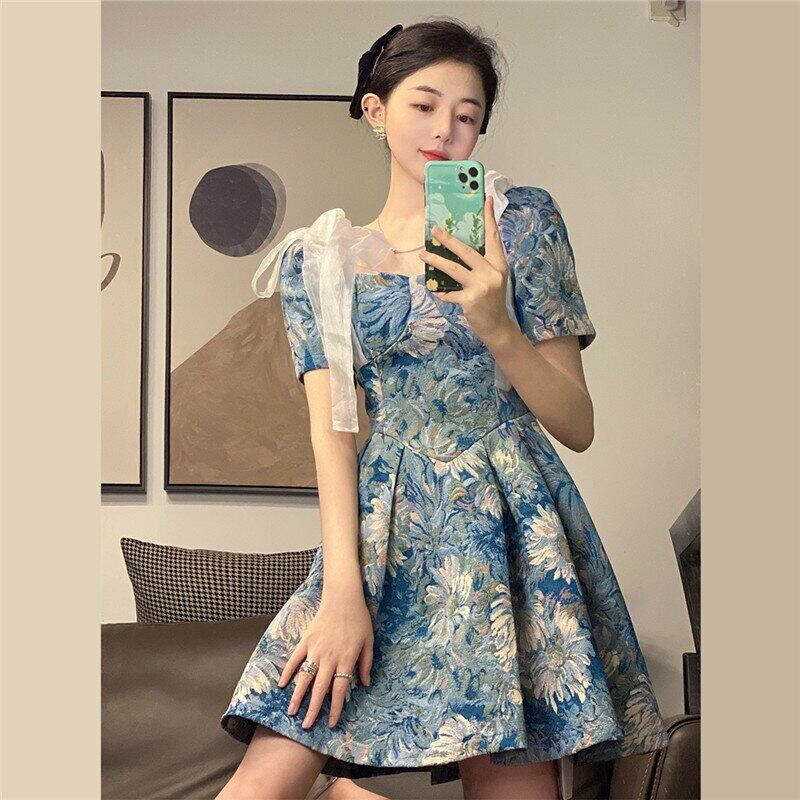 送料無料୨♥୧ サマーレディーススタイルミニドレス カラーリボンフローラルプリントスタンダードウェストヴィンテージスリーブ レトロ 夏物 花柄 スクウェア ビンテージ AOS5054128989
