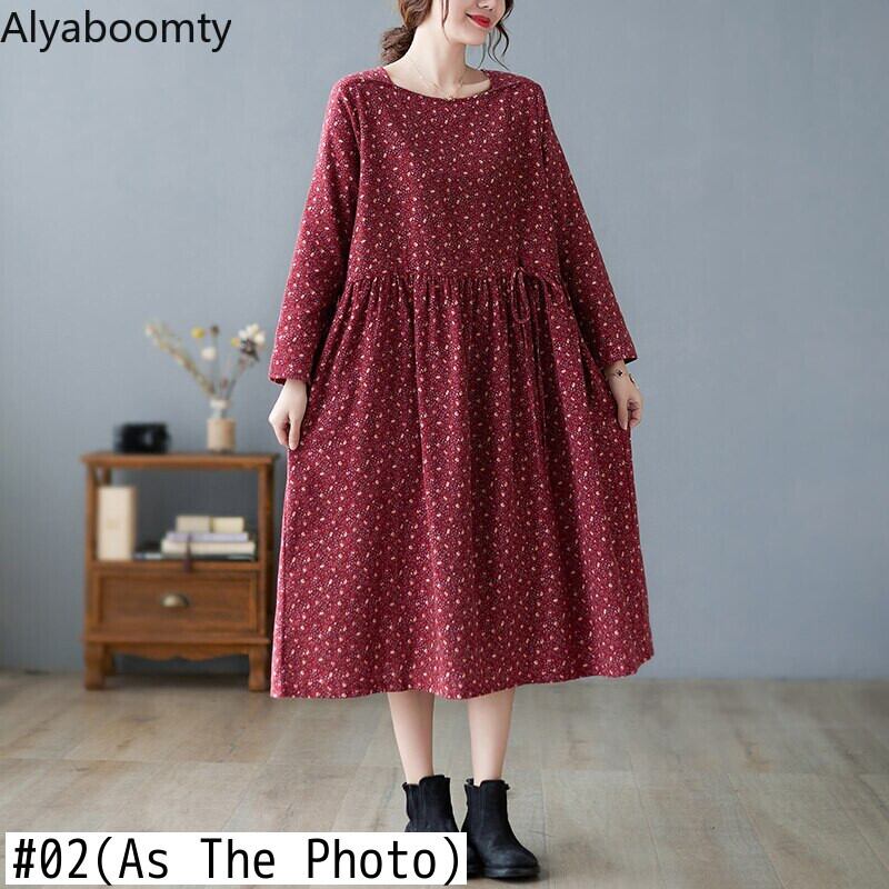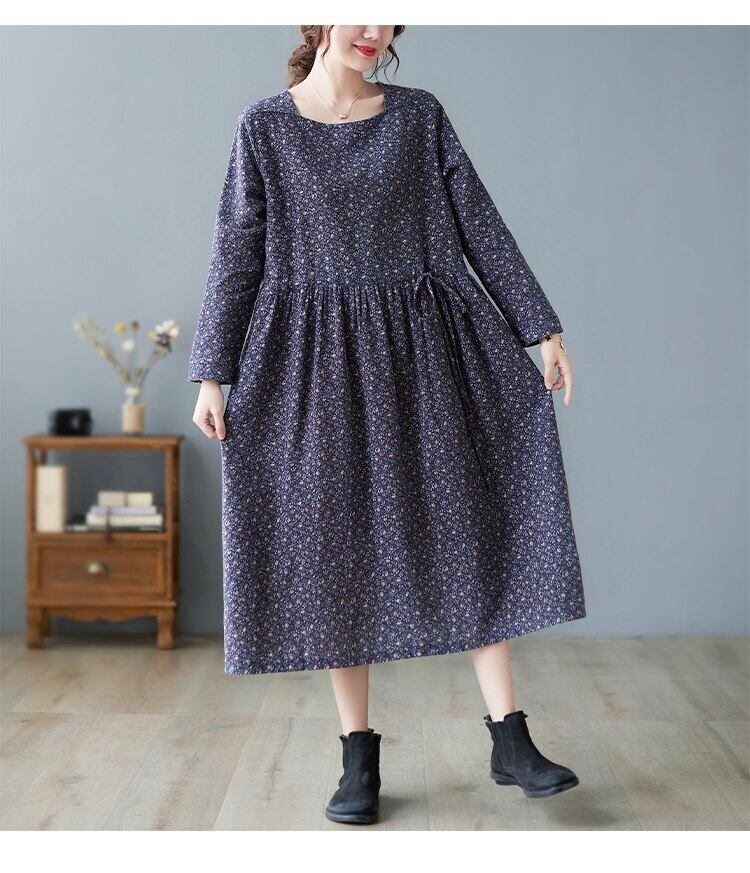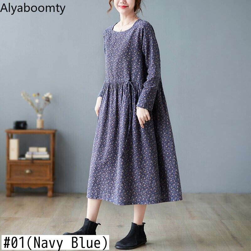 送料無料୨♥୧ オータムスプリングルーズレディースネイビーブルーレッドフローラルプリント柄ドレス ヴィンテージミディ コットン 春物 秋物 花柄 ビンテージ AOS31866000312
