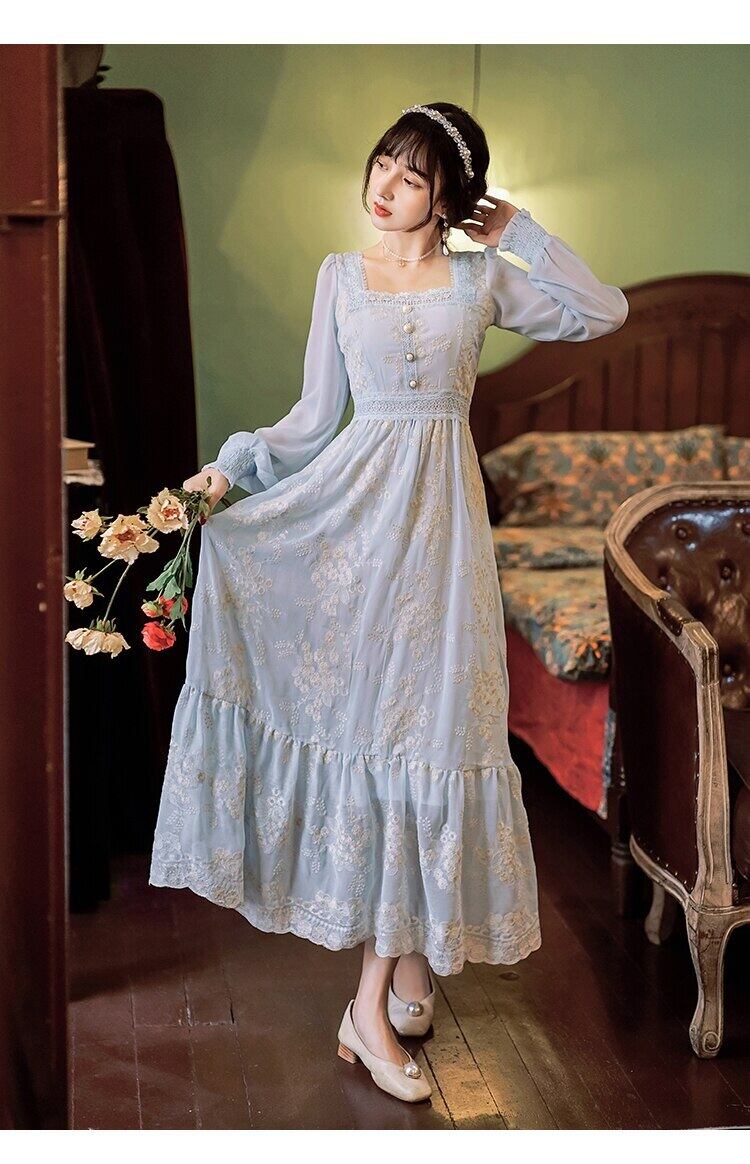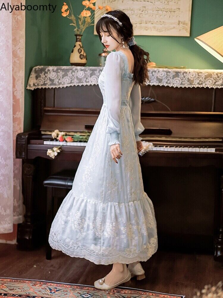 送料無料୨♥୧ スプリング秋レディースマキシロング妖精ドレス アプリコットブルーフローラル刺繍繊細レースフリルシック AOS23926531687