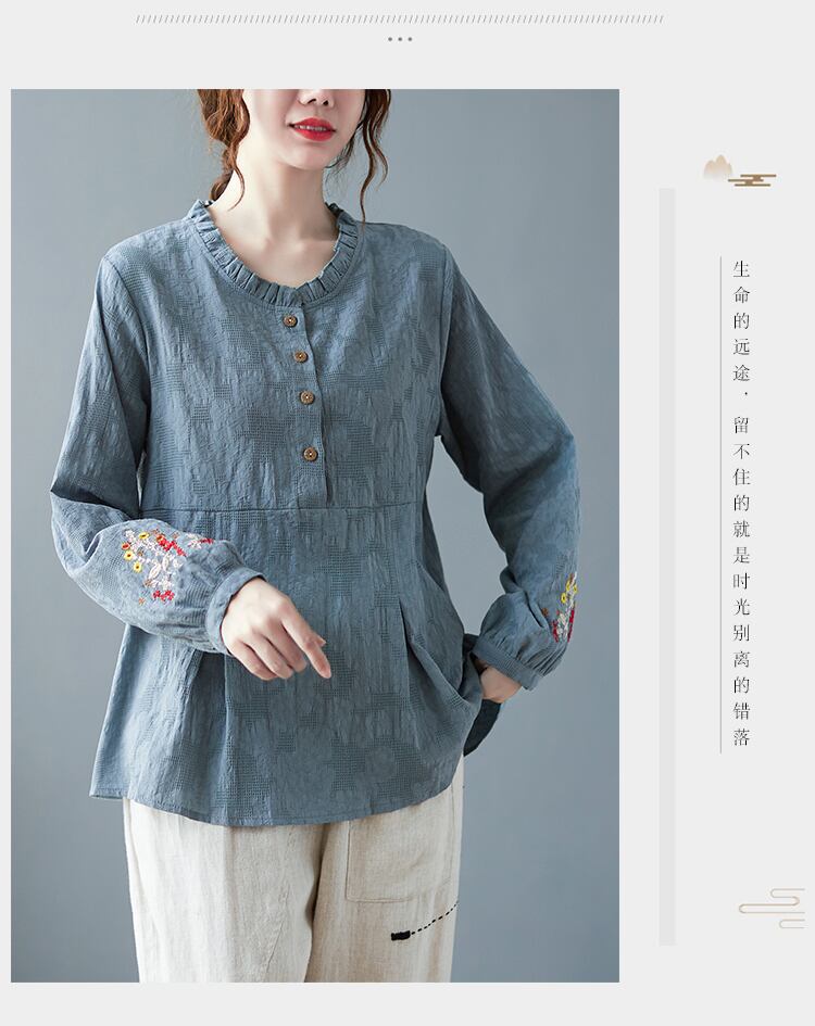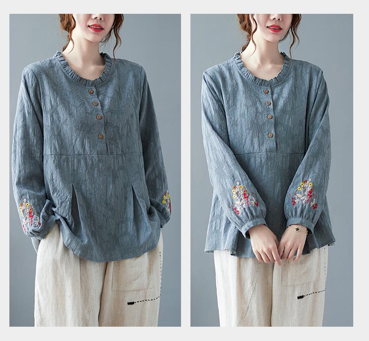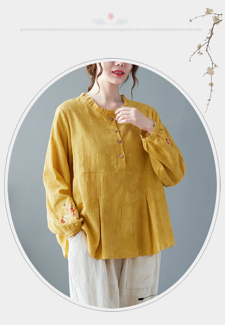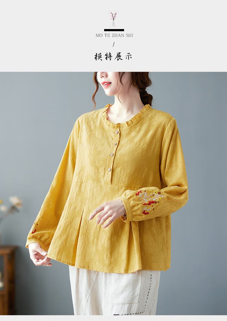 送料無料୨♥୧ スプリング秋レディースルーズトップス カラーイエローフローラル刺繍シャツ ヴィンテージジャカードコットンブラウス AOS41186486349