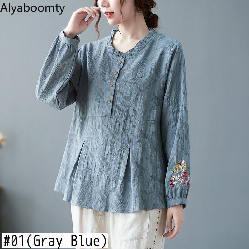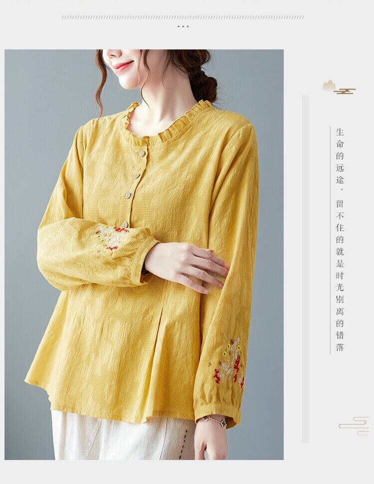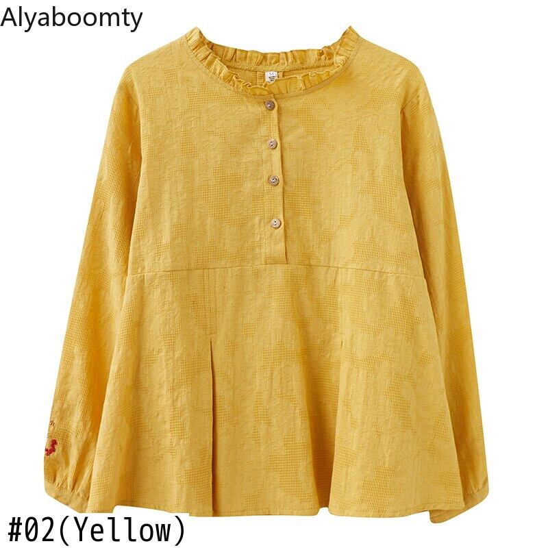 送料無料୨♥୧ スプリングレディースルーズトップス カラーイエローフローラル刺繍シャツ ヴィンテージジャカードブラウス ブルー コットン 春物 花柄 ビンテージ AOS94171001435