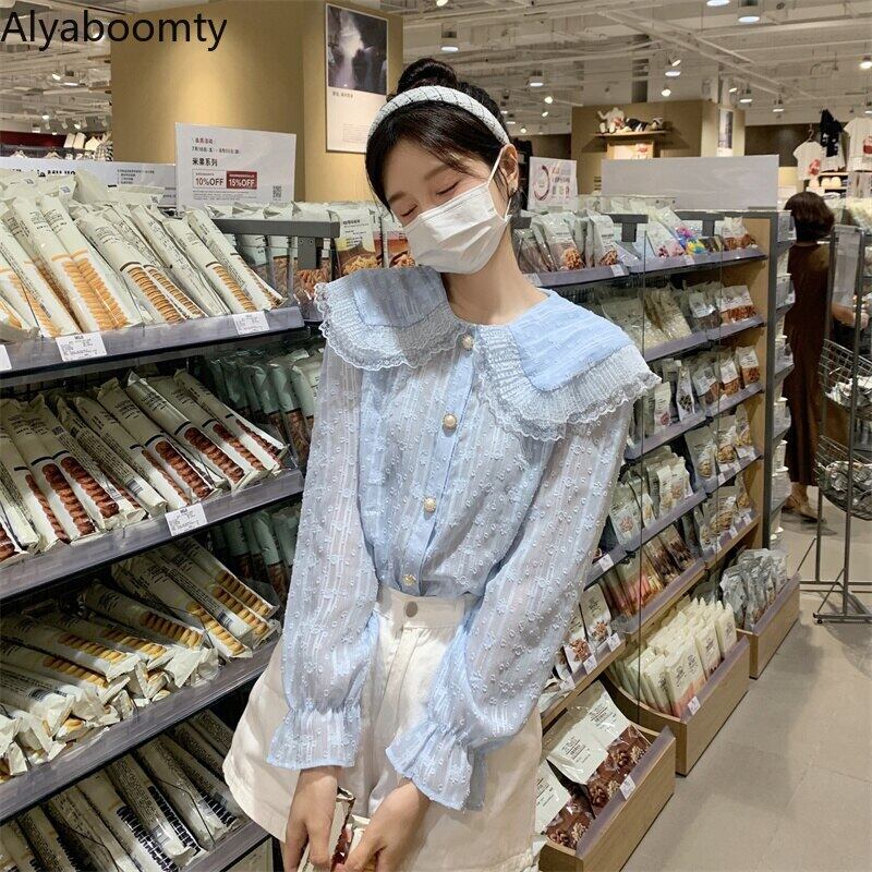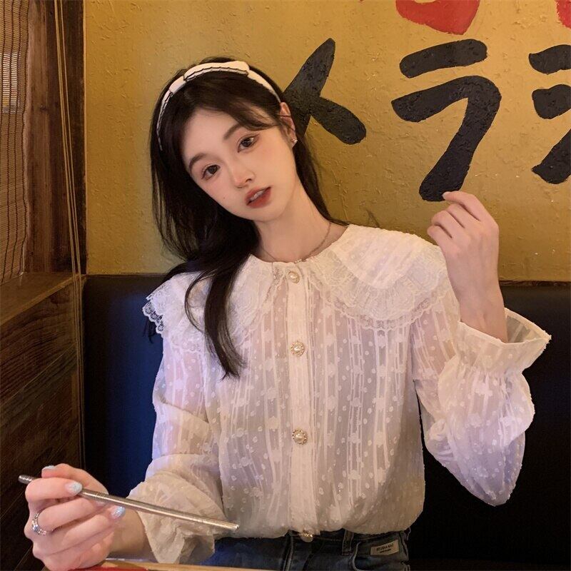 送料無料୨♥୧ スプリングオータムレディースブラウス カラーレースベージュブルールーズフリル長袖スリーブシャツ ロング ラッフル 大人ガーリー スウィート キュート カジュアル 春物 秋物 AOS75399122679
