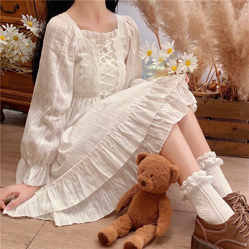 送料無料୨♥୧ スプリングレディースホワイトドレス カラーレースバンドフリル長袖スリーブ ロング レッド ラッフル 春物 スクウェア AOS21761829599