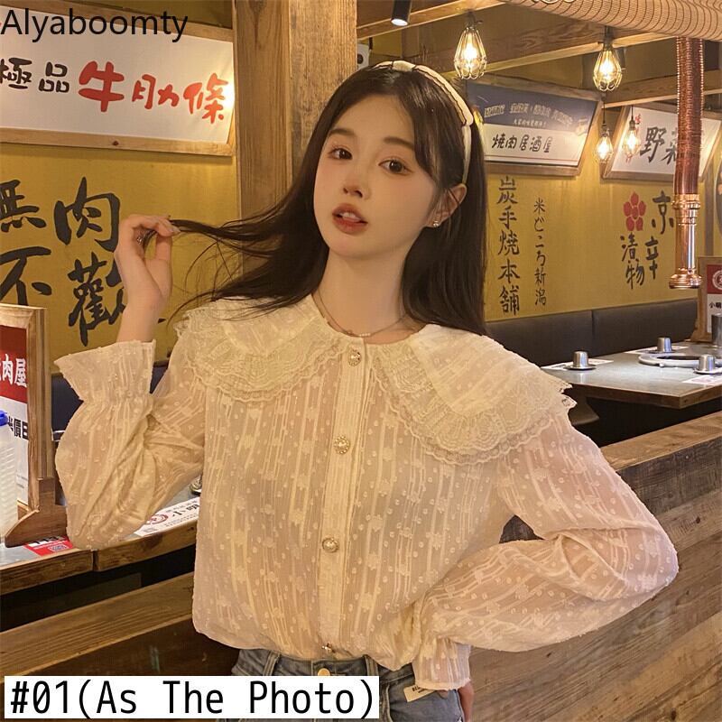 送料無料୨♥୧ スプリングオータムレディース甘いロリータブラウス ピーターパンカラーとレースベージュブルールーズ可愛いフリル長袖スリーブシャツ AOS82423351431