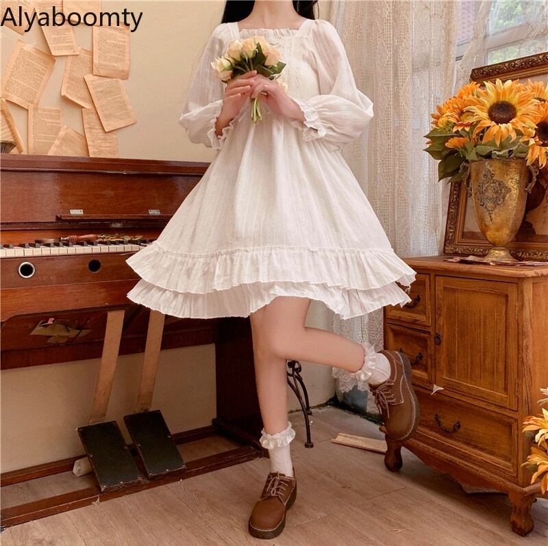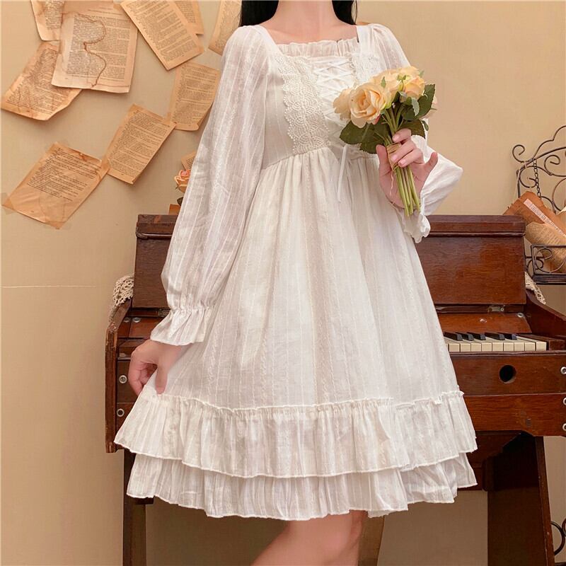 送料無料୨♥୧ スプリング秋レディースホワイトロリータドレス 平方カラーレースバンド愛らしいフリル長袖スリーブ AOS18795538727