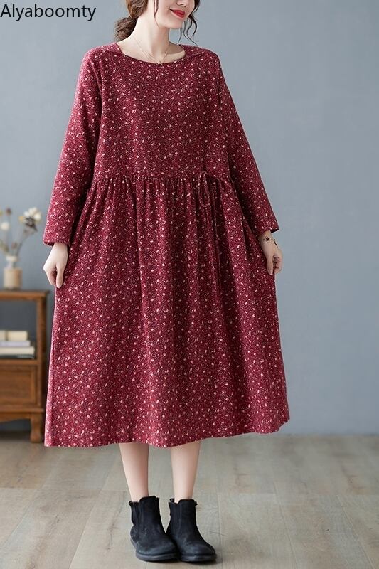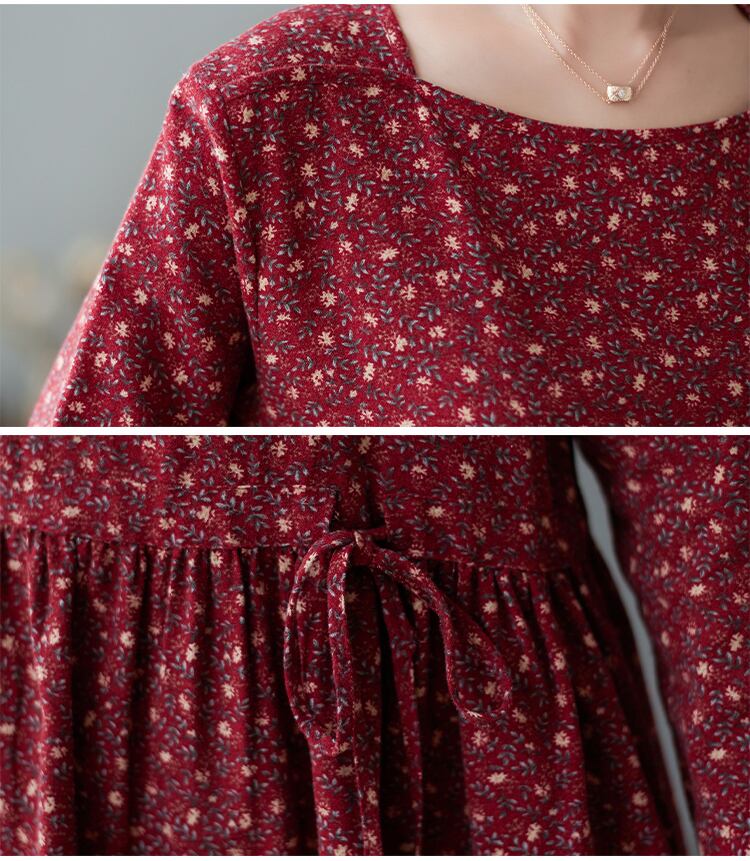 送料無料୨♥୧ オータムスプリングルーズレディース服ネイビーブルーワインレッドフローラルプリント柄特大ドレス ヴィンテージコットンミディ AOS42923226890