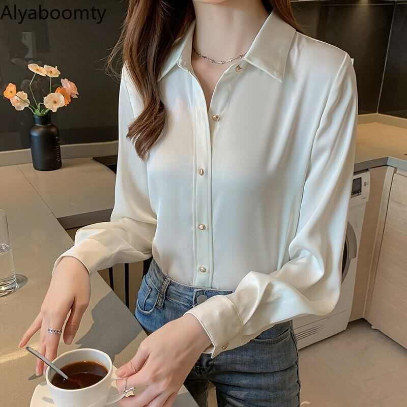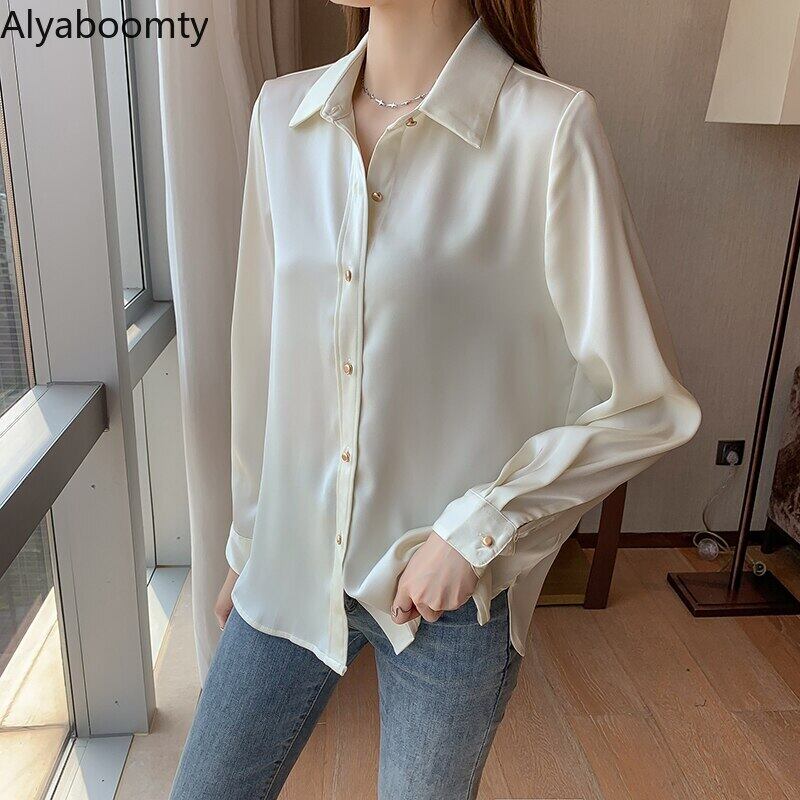 送料無料୨♥୧ スプリングオータムレディースソリッド シャツ カラーブラウス 長袖スリーブサテン ロング 春物 秋物 ソリッドカラー 会社 学校 通勤や通学にも AOS87713654682