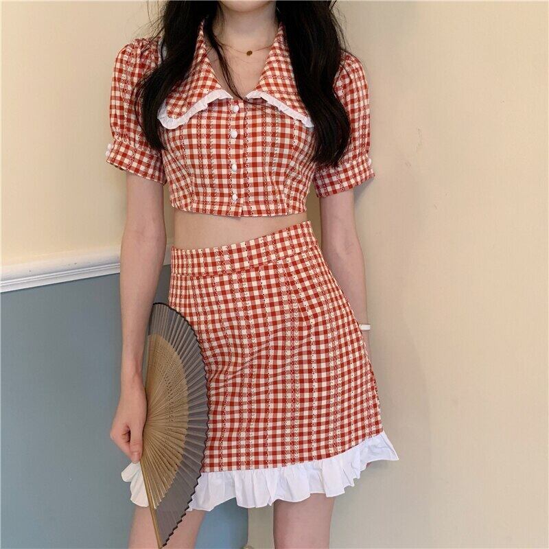 送料無料୨♥୧ サマーレディースストリートウェアカラーレッド格子柄フリルスカート スリムセット ラッフル 大人ガーリー スウィート キュート カジュアル かわいい 夏物 AOS54419453173