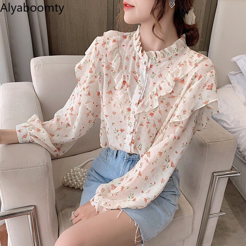 送料無料୨♥୧ スプリングオータムレディースシャツ カラーフローラルブラウス フリルシフォン ピンク ラッフル 大人ガーリー スウィート キュート カジュアル 春物 秋物 花柄 AOS73564324404