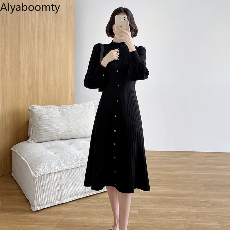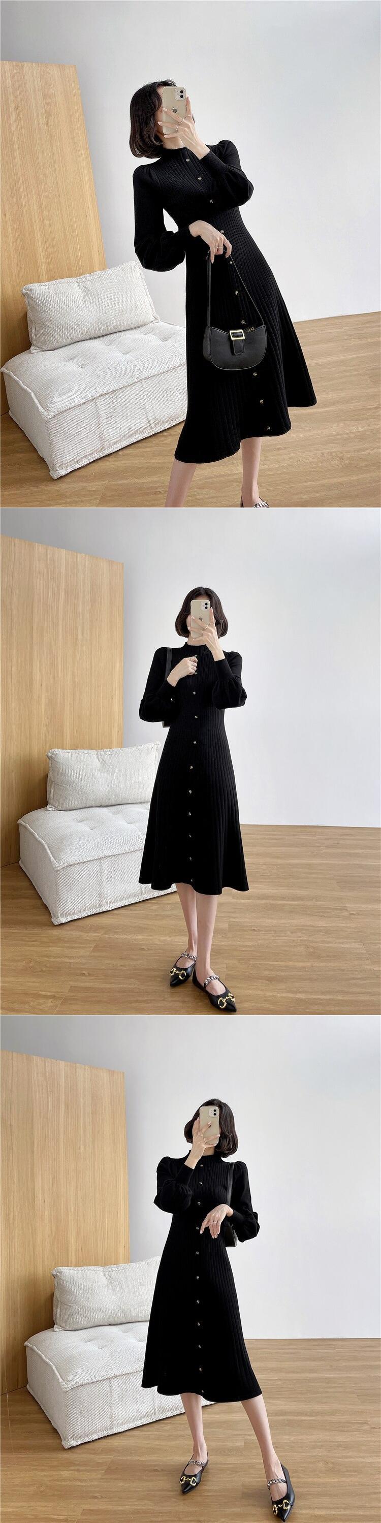 送料無料୨♥୧ オータムウィンターレディースニット ロングドレス ブラックアプリコットカーキボディコンスタイリッシュランタンスリーブセーター AOS42536454520