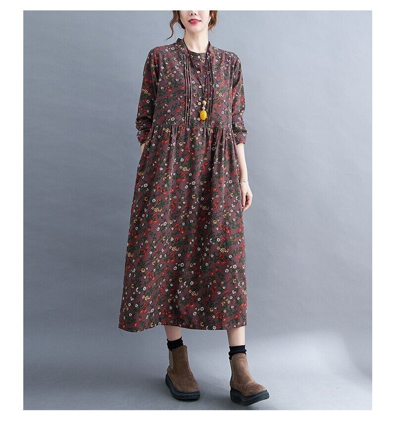 送料無料୨♥୧ 森オータムスプリングレディースロングバギードレス スタンドカラーカラーコーヒーブラウンフローラルプリントコットンliennヴィンテージ AOS3944706911