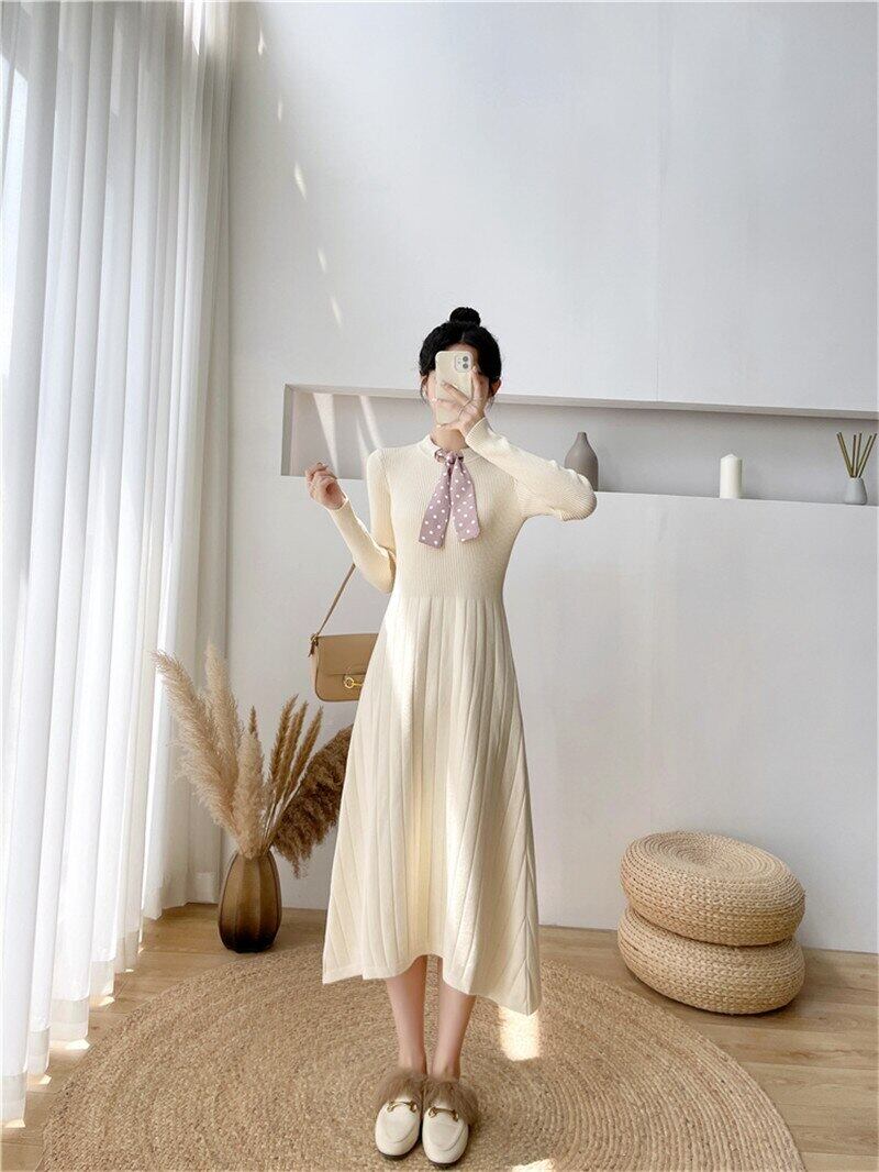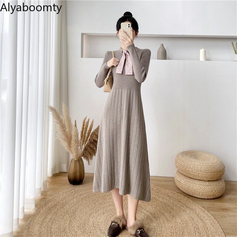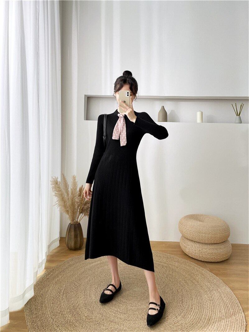 送料無料୨♥୧ ウィンターレディース厚くするニットAラインドレス ブラックアプリコットボディコン柔らかいニット ロングリボンソリッド セーター AOS97138027541