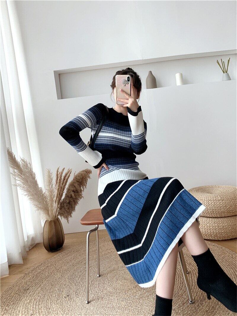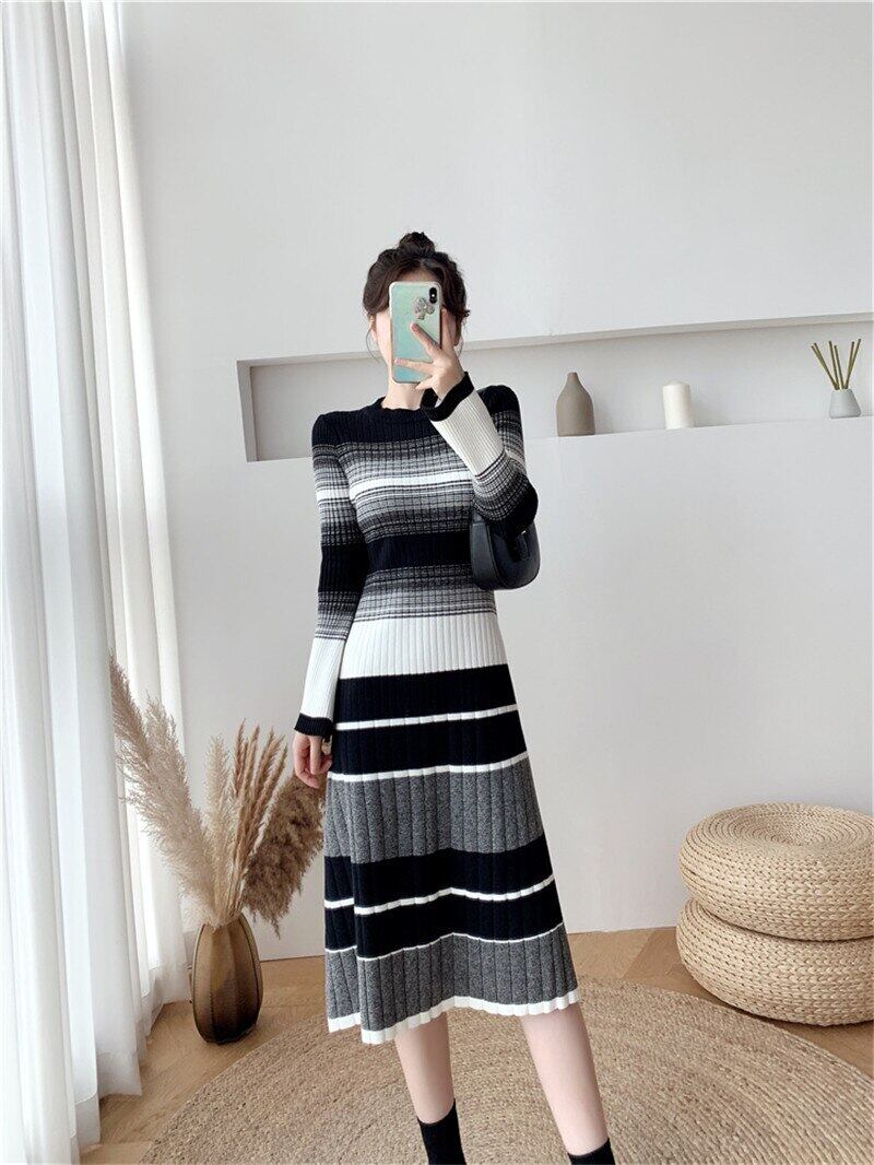 送料無料୨♥୧ オータムウィンターレディースニット ドレス コントラストカラーストライプ厚いセーター AOS71140320855