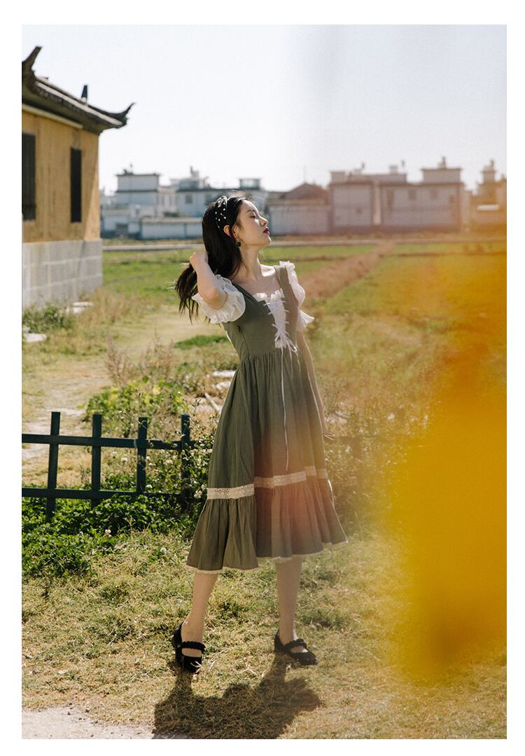 送料無料୨♥୧ 森サマーレディースドレス 平方カラーパッチワークバンドグリーンシック半袖スリーブコットンフリル AOS36580310105
