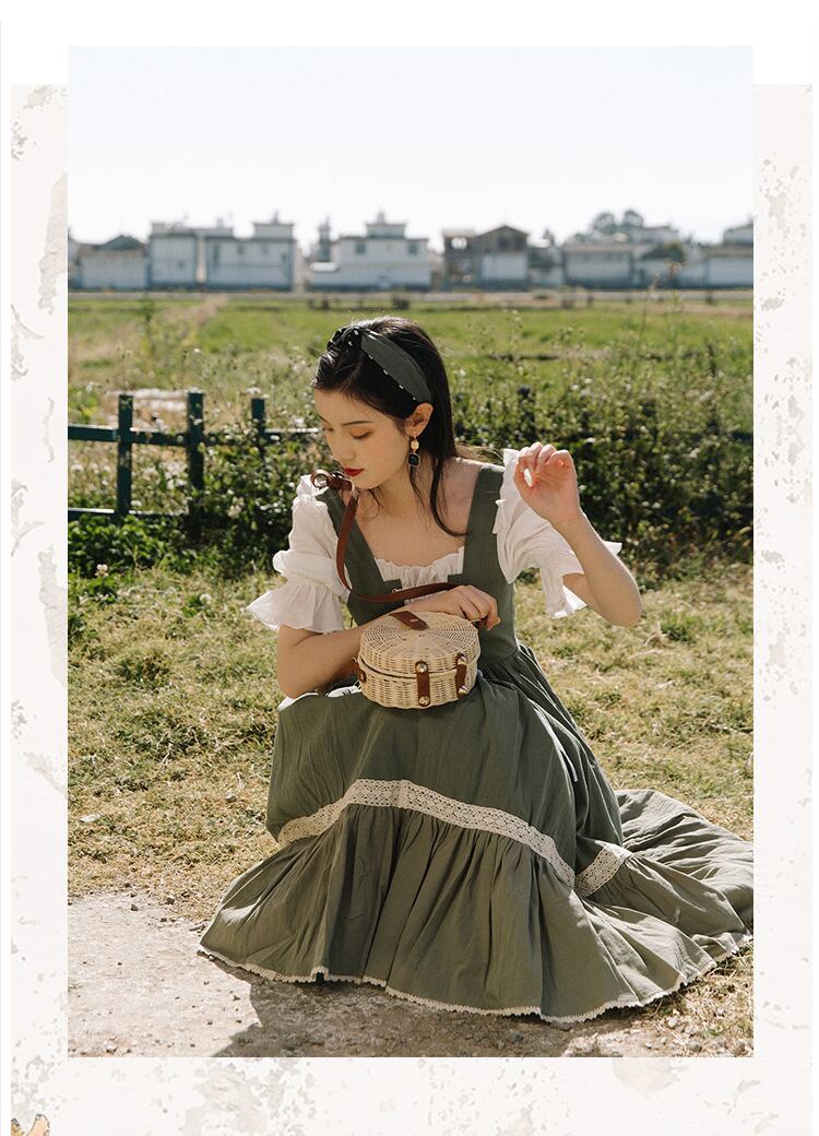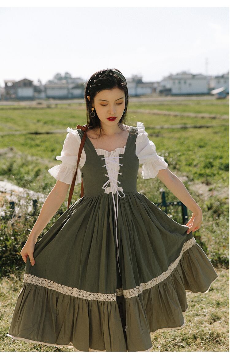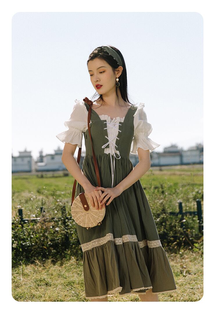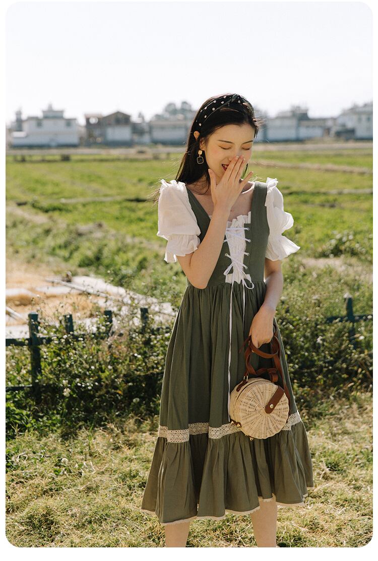 送料無料୨♥୧ サマーレディースドレス カラーパッチワークバンドグリーン半袖スリーブフリル ショート コットン ハーフスリーブ ラッフル 大人ガーリー スウィート キュート カジュアル 夏物 スクウェア AOS92245900336