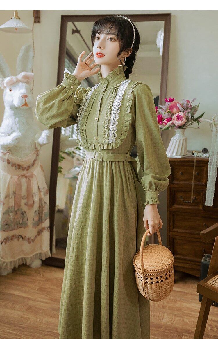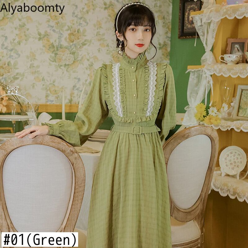 送料無料୨♥୧ イングランドスタイルスプリングオータムレディースロングドレス カラーレースフリルベルト 繊細ヴィンテージランタンスリーブグリーン AOS51946139866